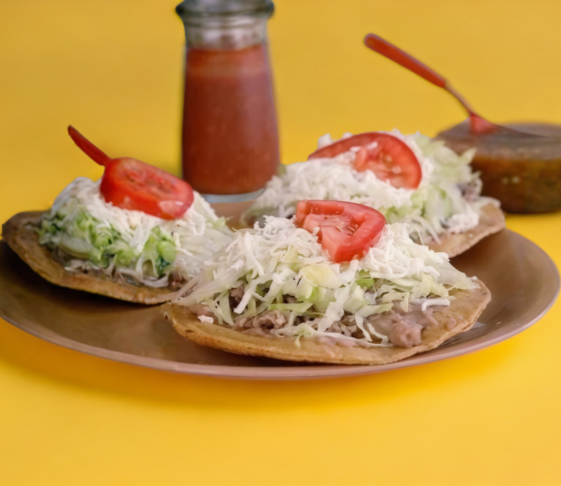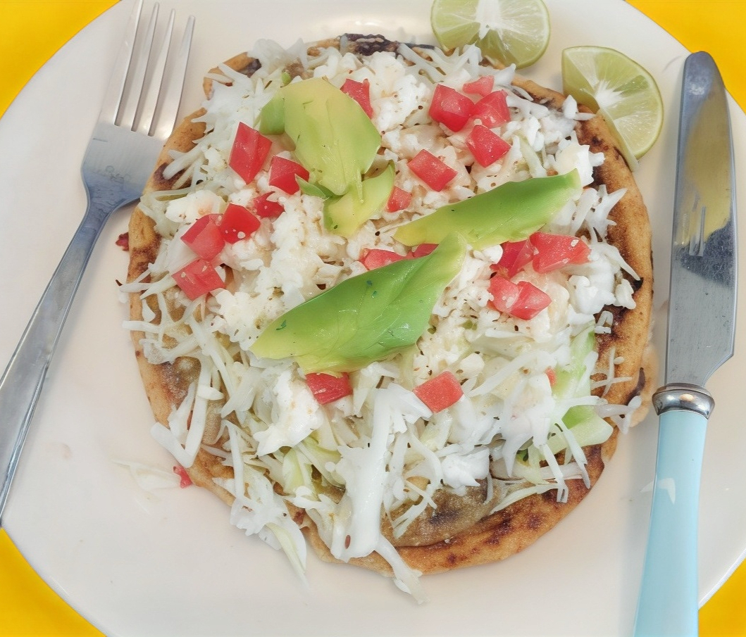 Masa frita con frijoles, guiso a elegir, lechuga, queso, jitomate y crema.