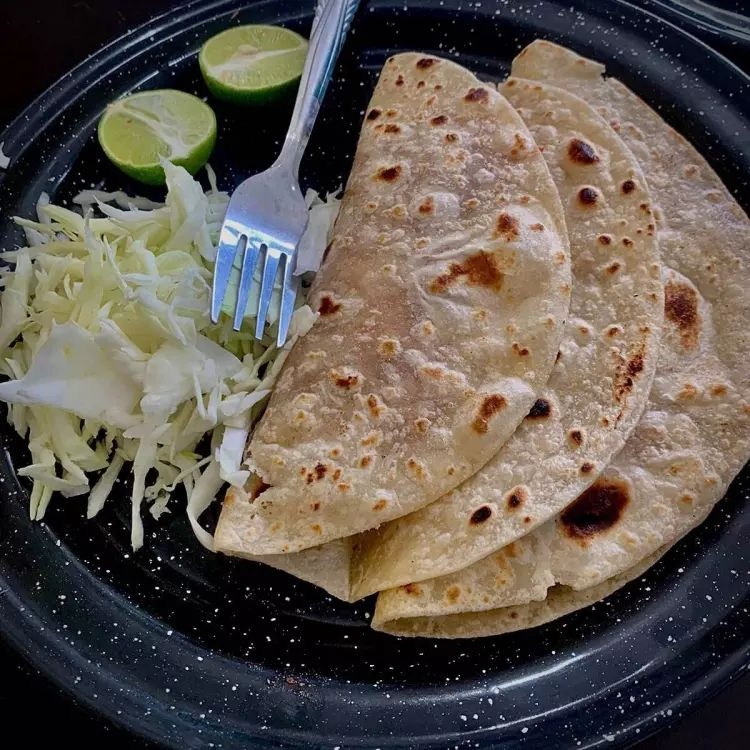 Tortilla casera de harina chica más guiso a elegir frijoles y verdura
