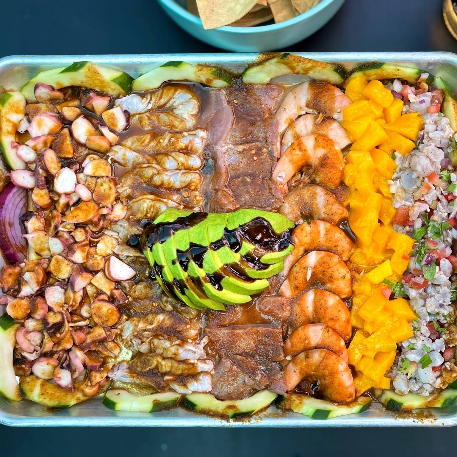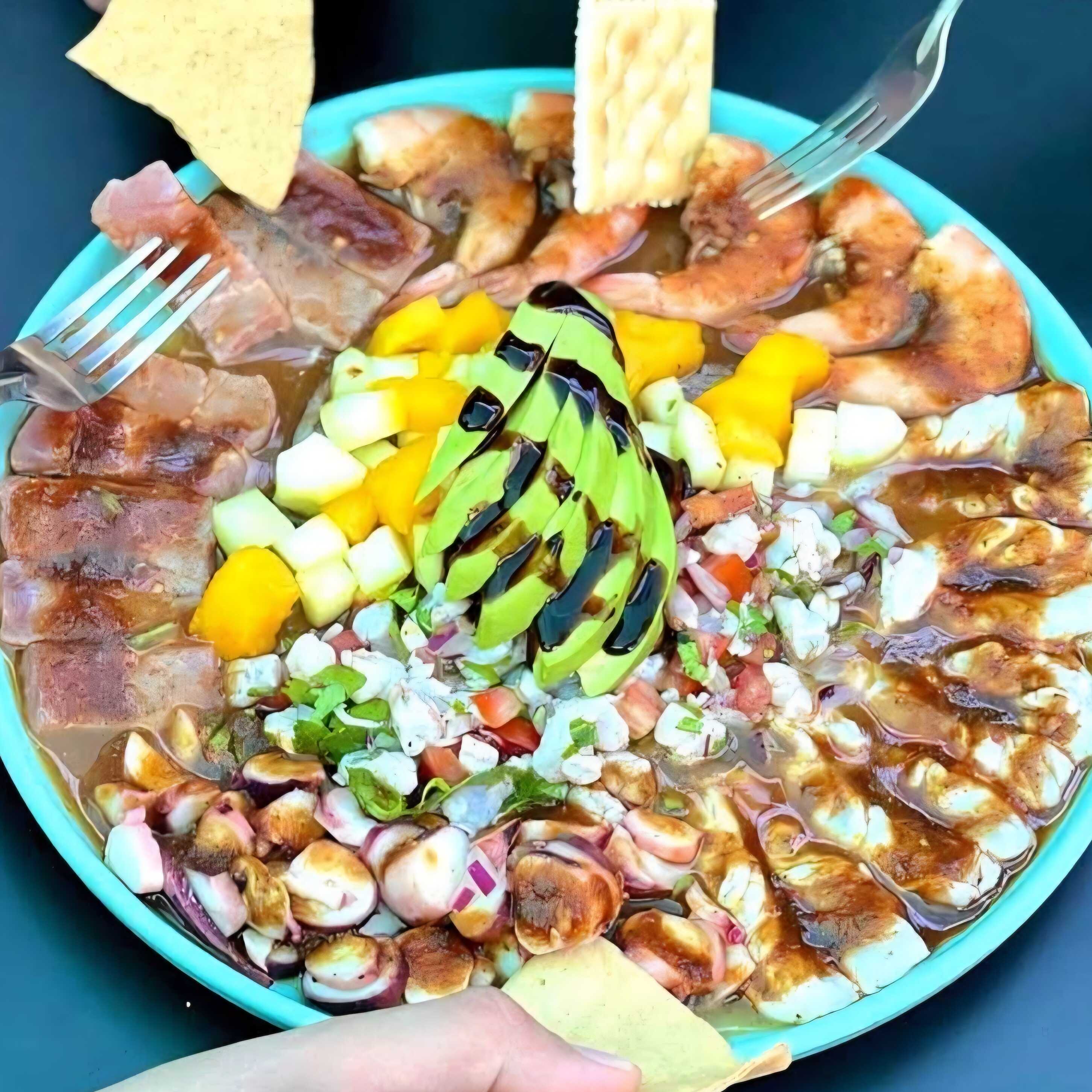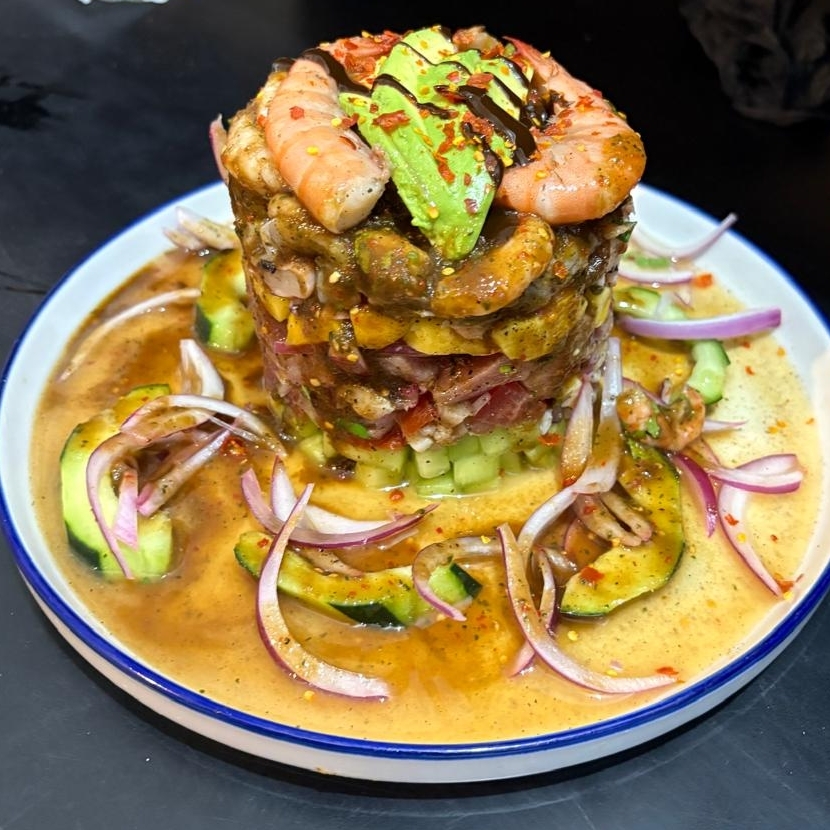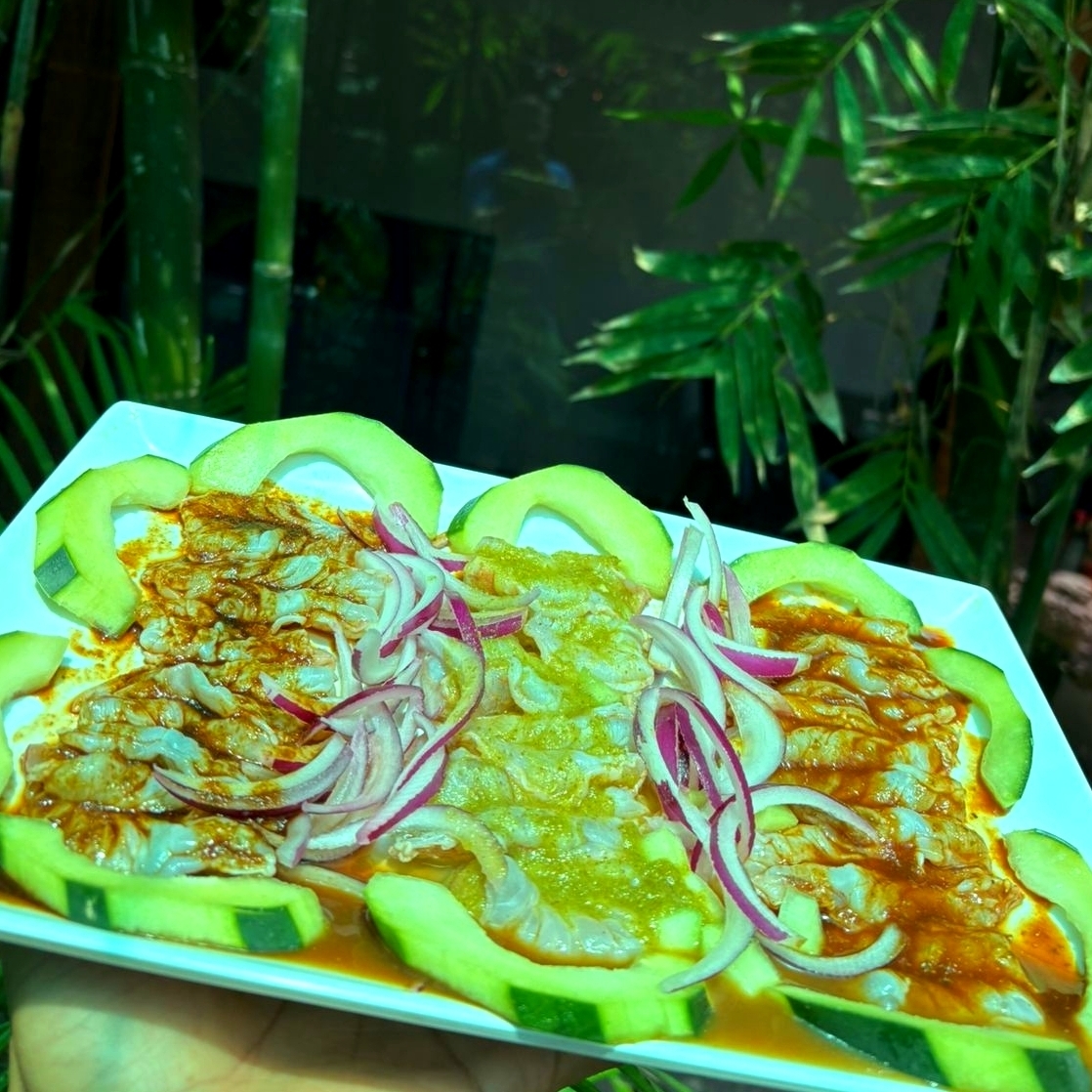 Un poco de lo mas fresco y rico, camarones curtidos y cocidos, atún, pulpo y más, bañados en salsa chiltepin