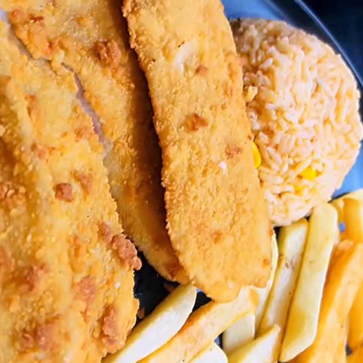 Orden de filete de pescado empanizado y crujiente, acompañado de arroz, papas fritas y pan.