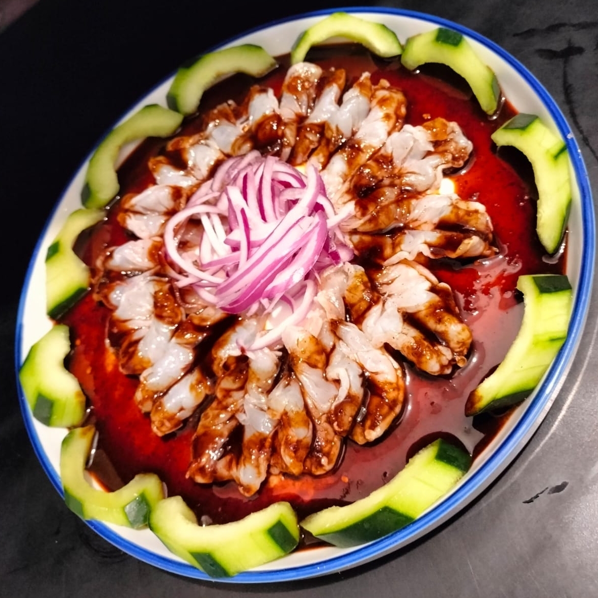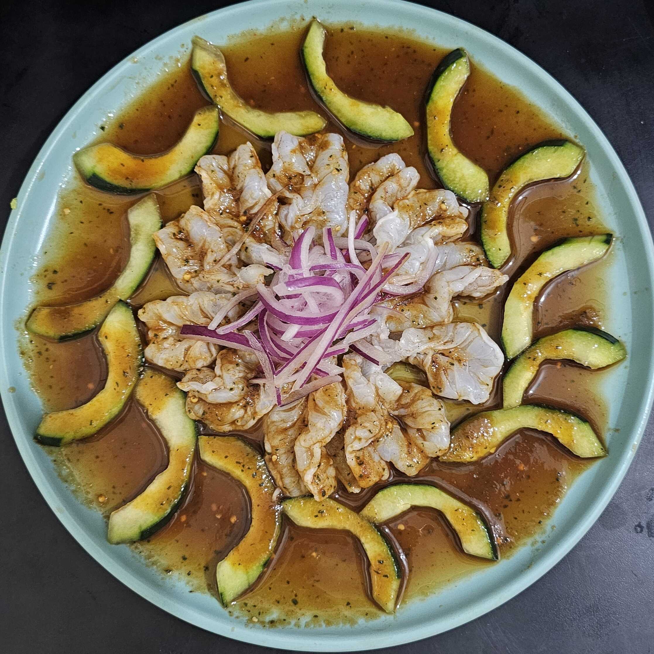 Camarones curtidos en limon, bañados en salsas negras con pepino.