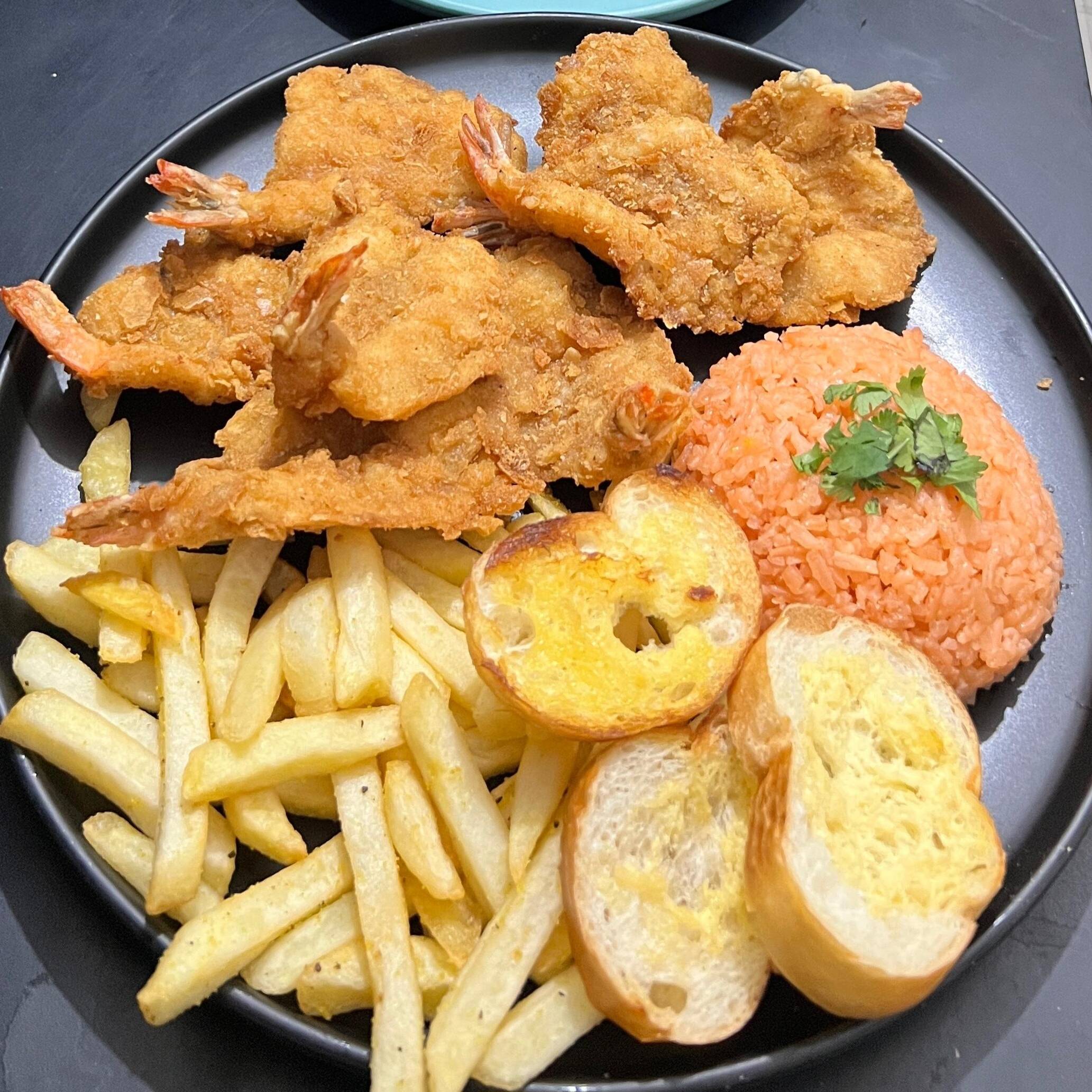 Orden de camarones empanizados y crujientes, acompañados de arroz, papas fritas y pan.