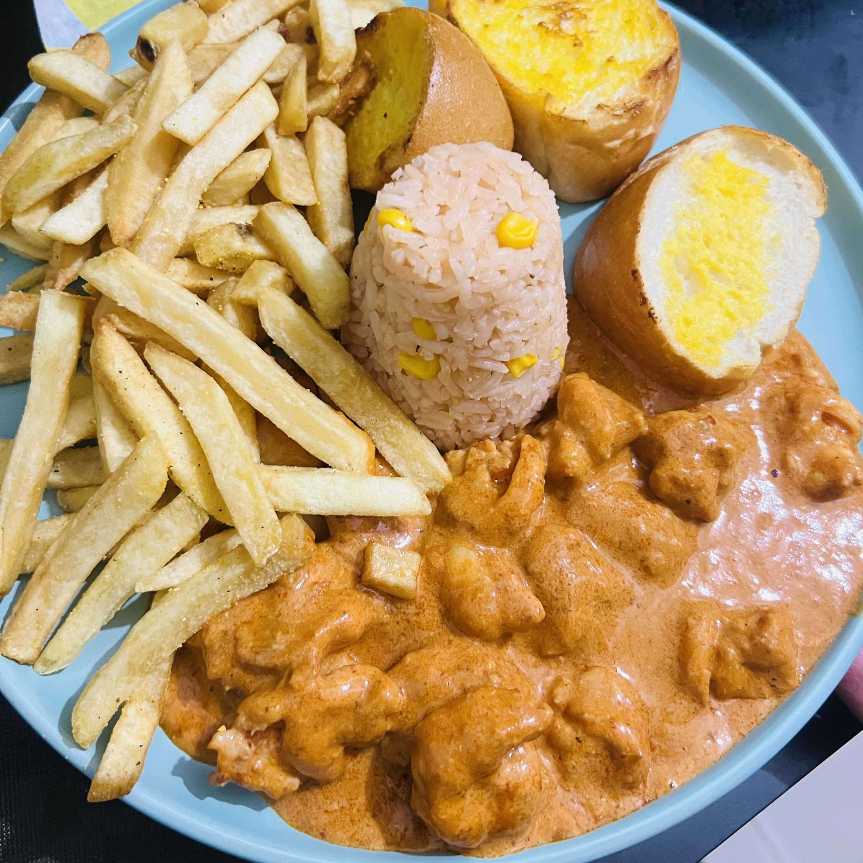 Camarones en salsa de chipotle, acompañados de arroz, papas fritas y pan.