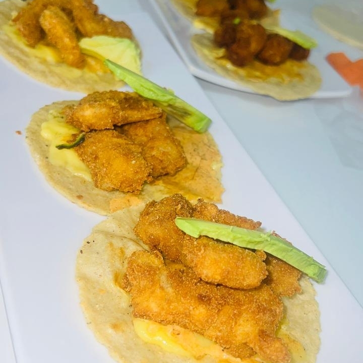 Orden de 3 tacos de chicharron de camarón, con costra de queso gouda y tortillas recien hechas.