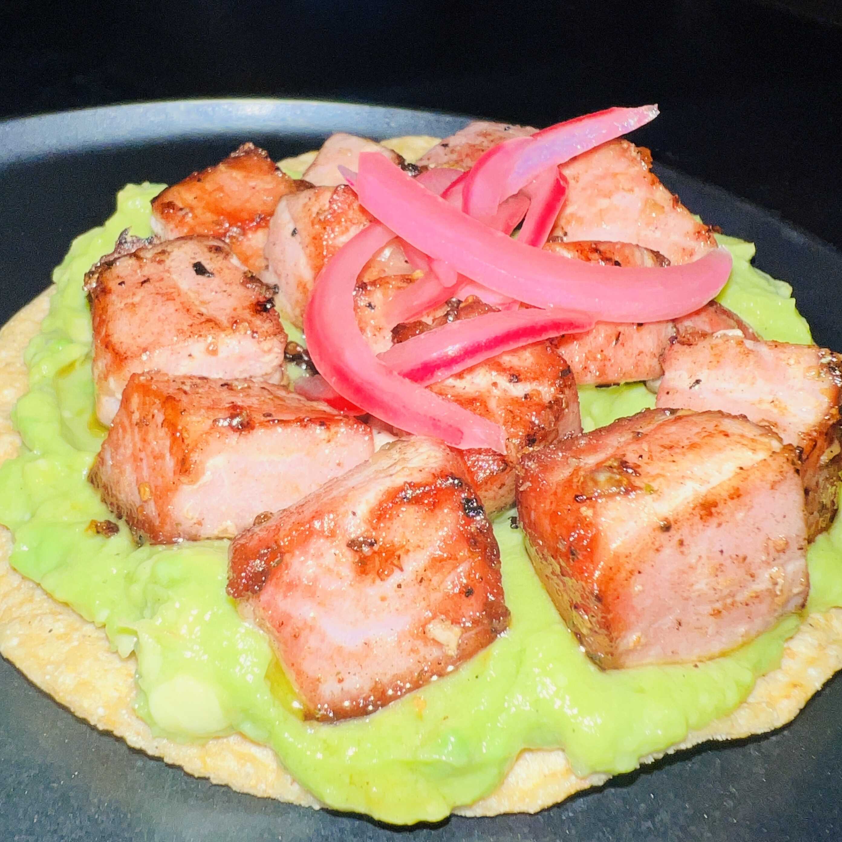 Tostada de carnitas de atun, sobre una cama de guacamole y un toque de cebolla morada curtida.