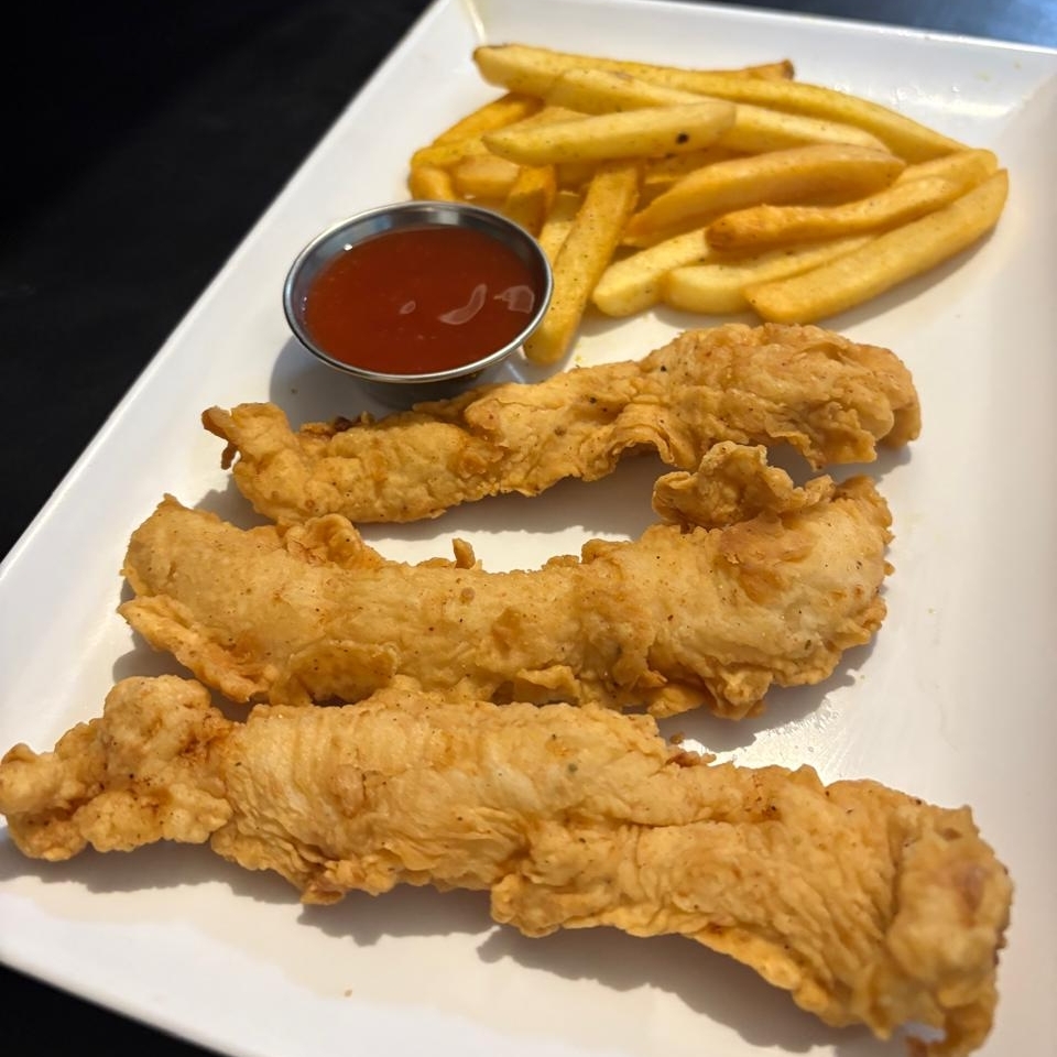 3 tenders de pechuga de pollo, acompañadas con papas fritas.
