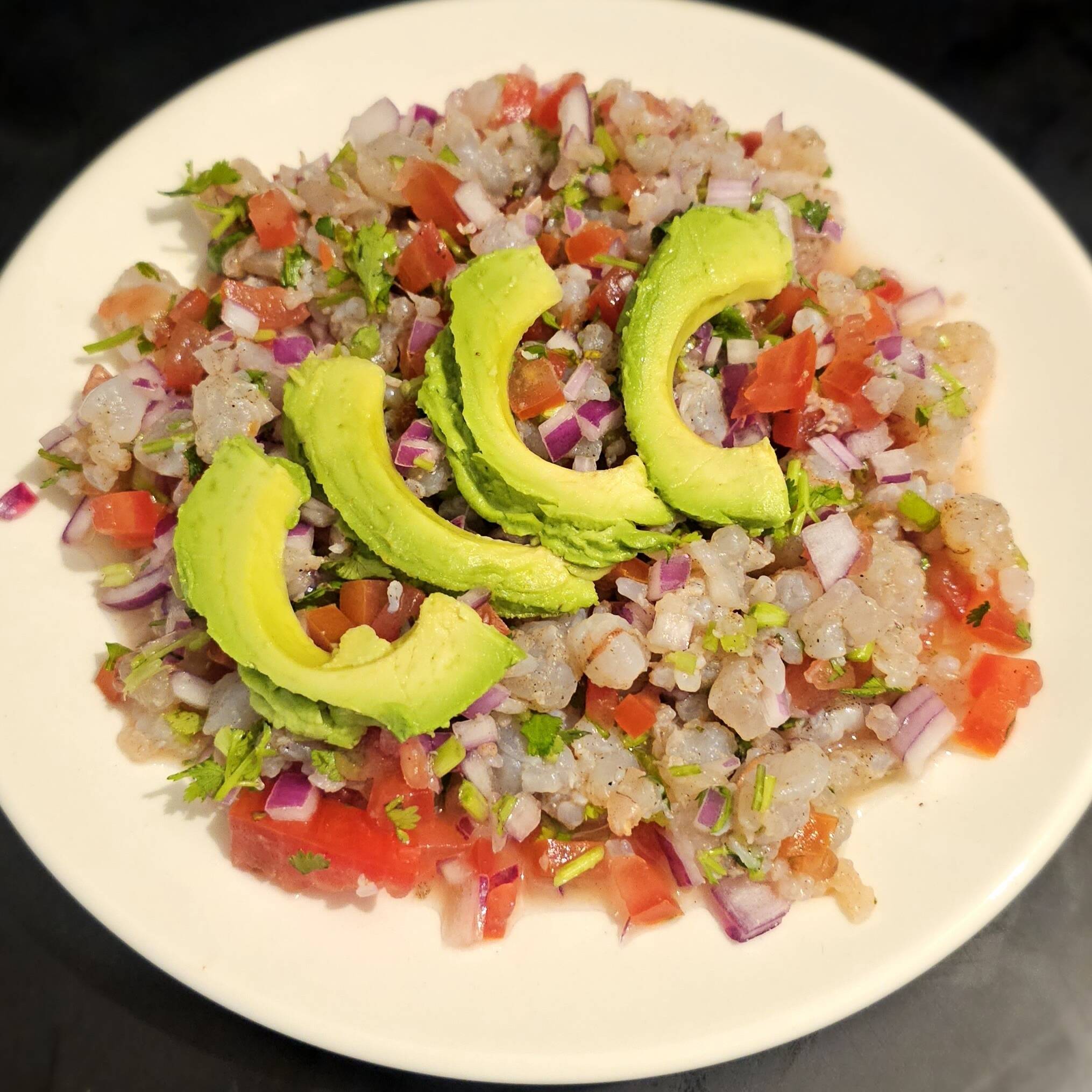 Ceviche de pescado, curtido con tomate, cebolla morada y cilantro.