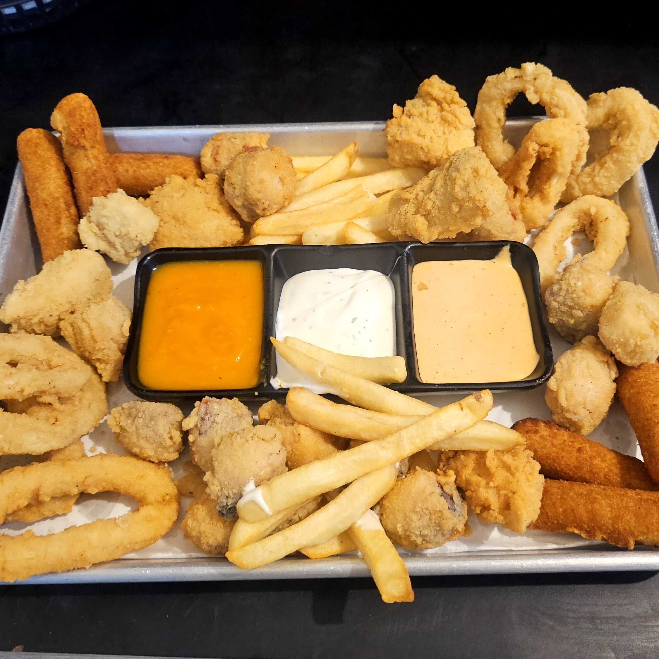 Lo mejor de nuestros productos fritos y crujientes, chicharron de pescado, aros de calamar, dedos de queso y papas fritas.
