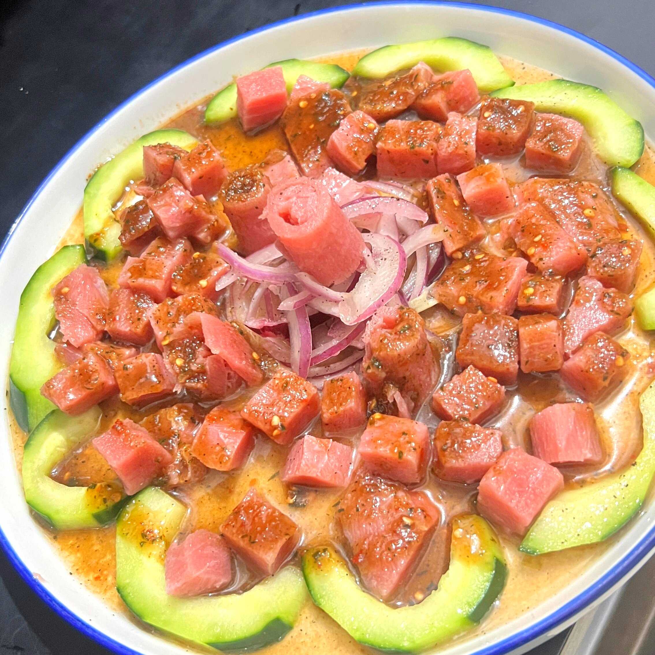 Aguachile de atun fresco curtido, con tu salsa a elegir. Chiltepin, negra o verde.