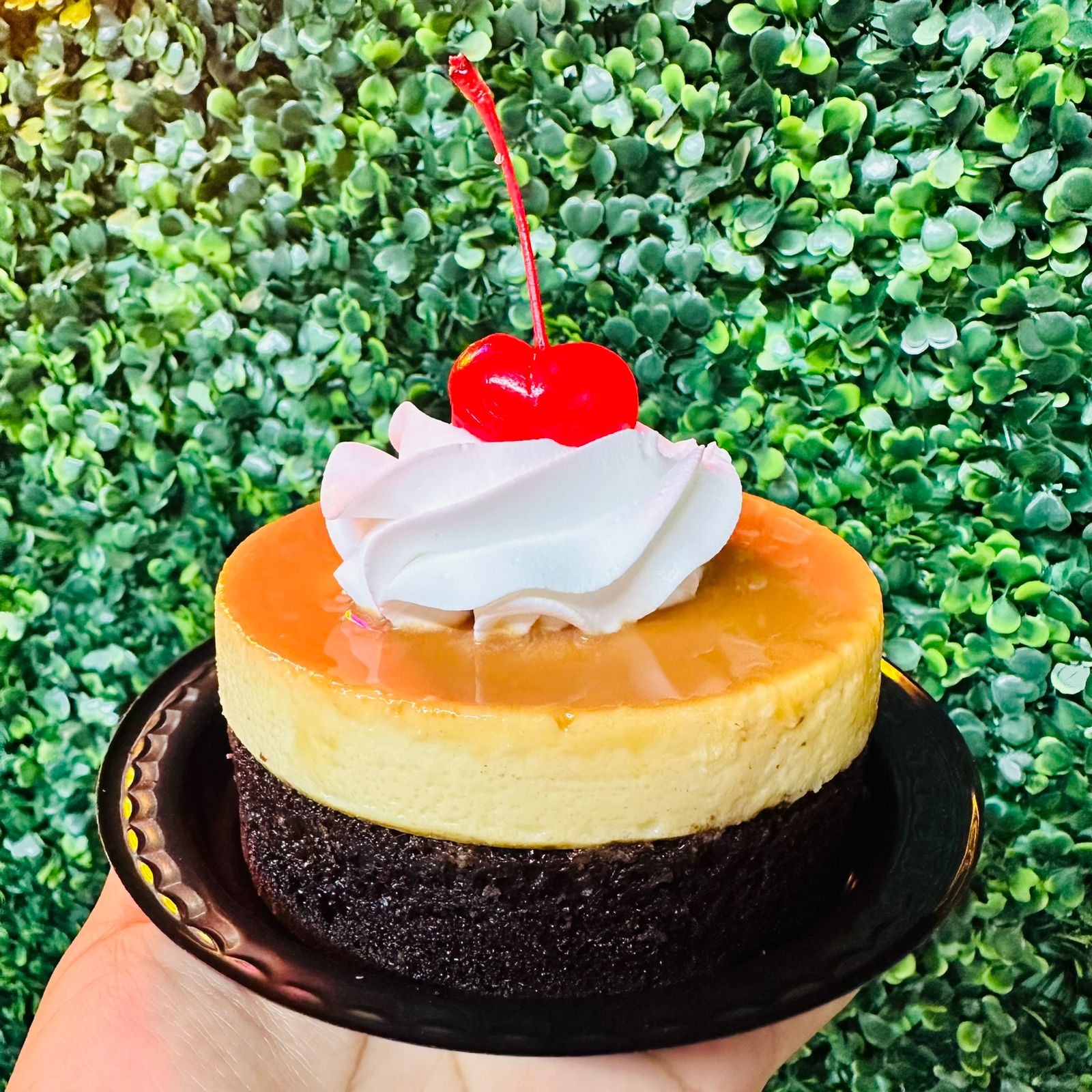 Exquisito postre compuesto de dos capas, una de flan y otra de bizcocho de chocolate, decorado con crema batida sabor vainilla y cereza, presentación individual.