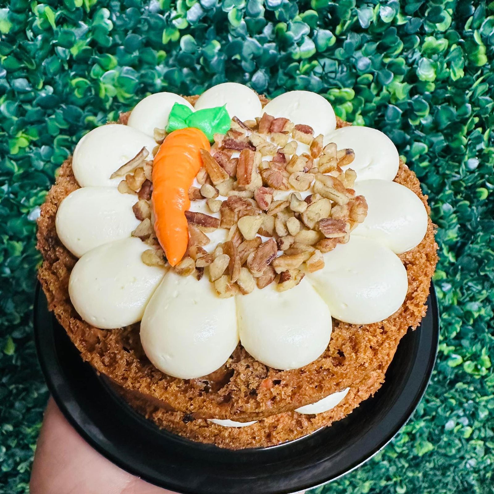 Esponjoso pan de zanahoria, relleno con frosting de queso crema philadelphia muy cremoso, decorado con nueces y con una zanahoria del mismo frosting, presentación individual.