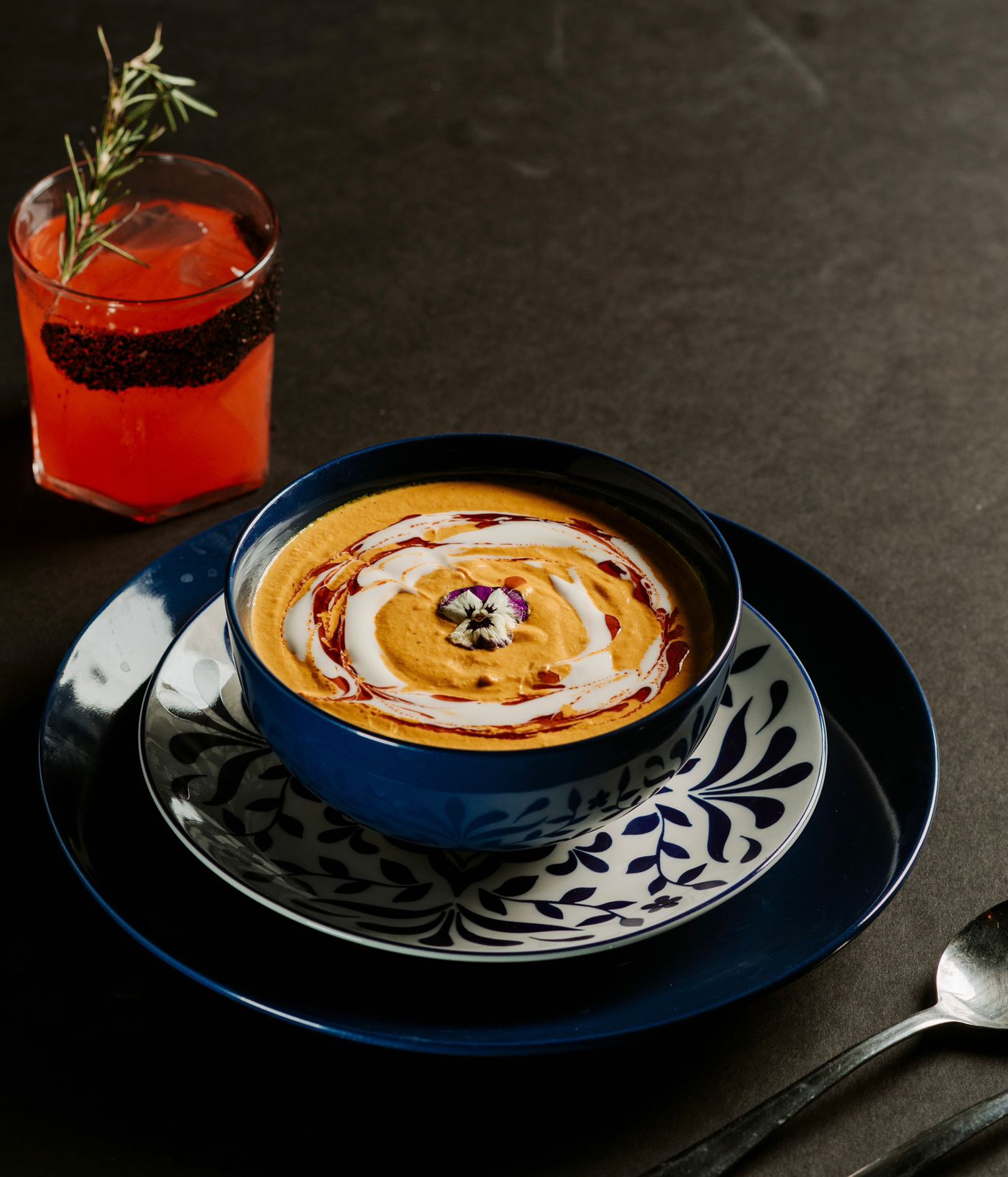 Decorada con aceite de chiles, crema acida y flor viola
