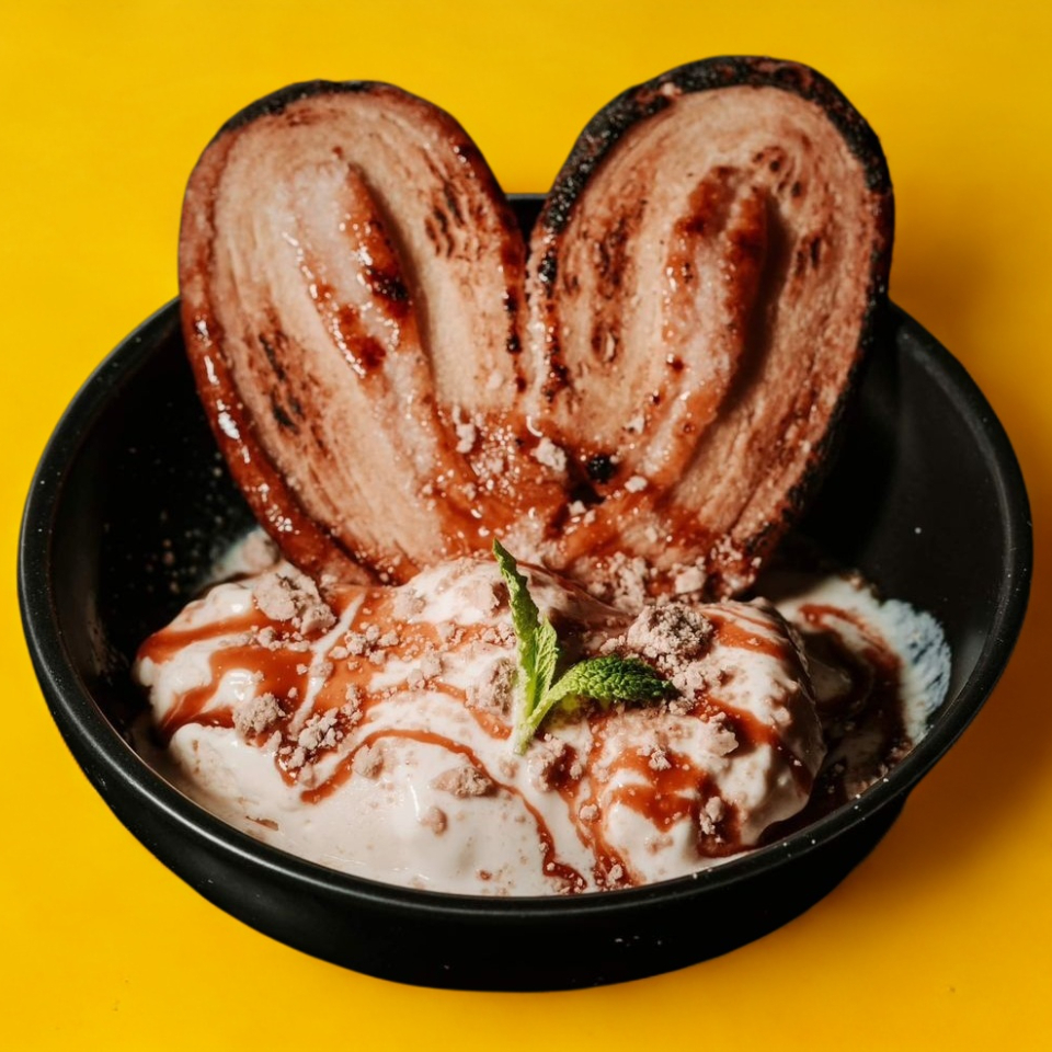 Con nieve de vainilla, cajeta con mezcal y mazapan