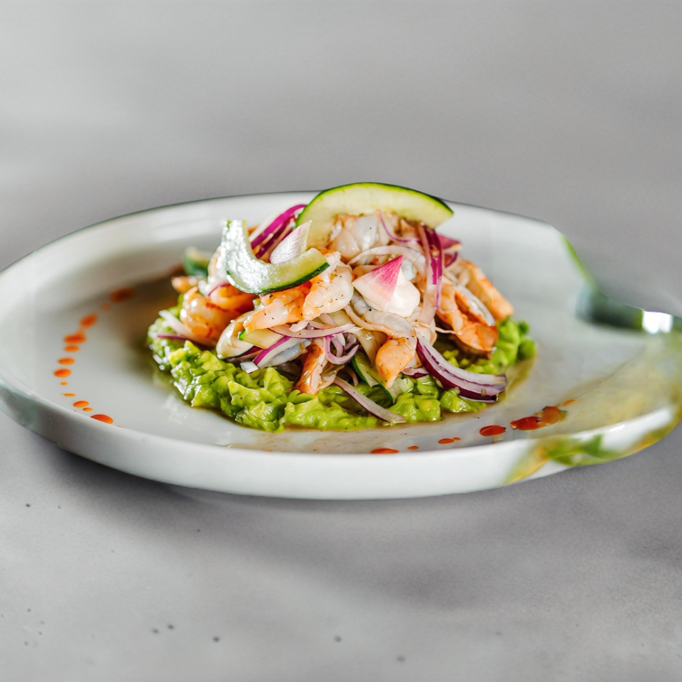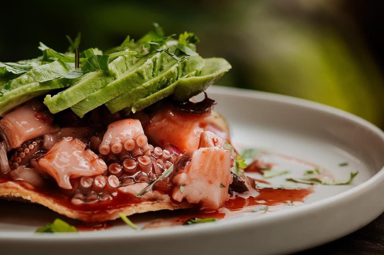 Ceviche de pulpo sobre salsa cremosa y un abanico de aguacate