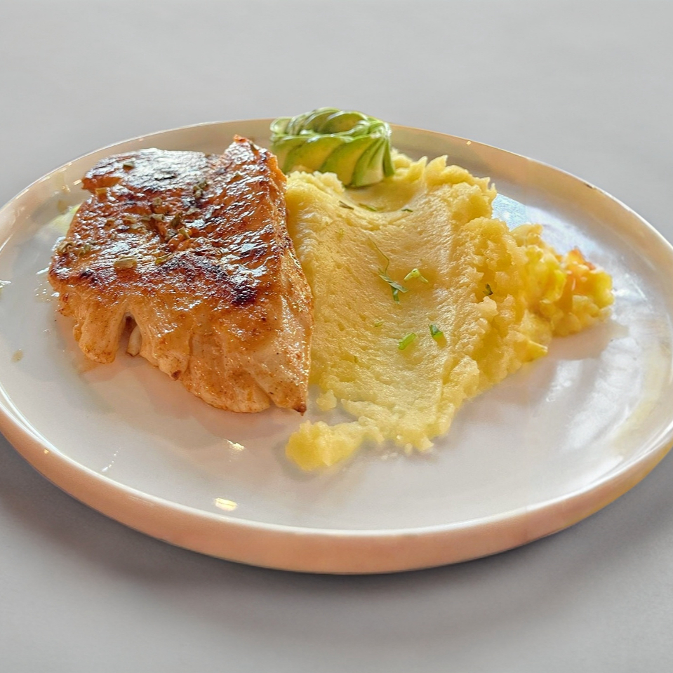Acompañada de pure de papa, ensalada de arugula y aguacate