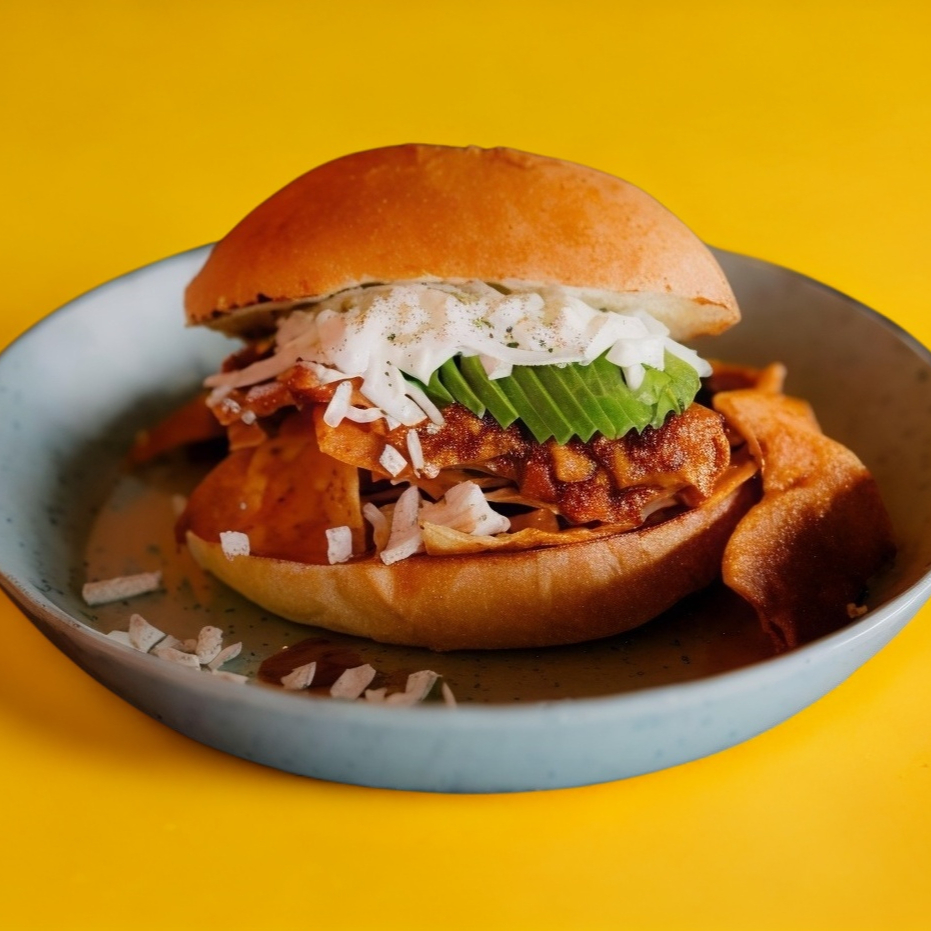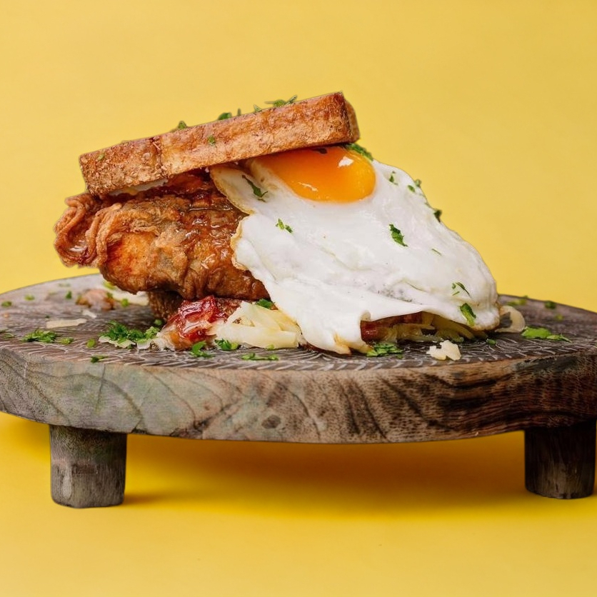 Sándwich de pechuga de pollo empanizado, tocino, caramelizado, queso y un huevo estrellado.