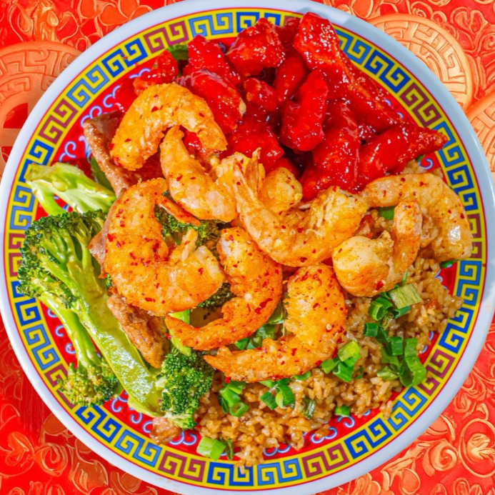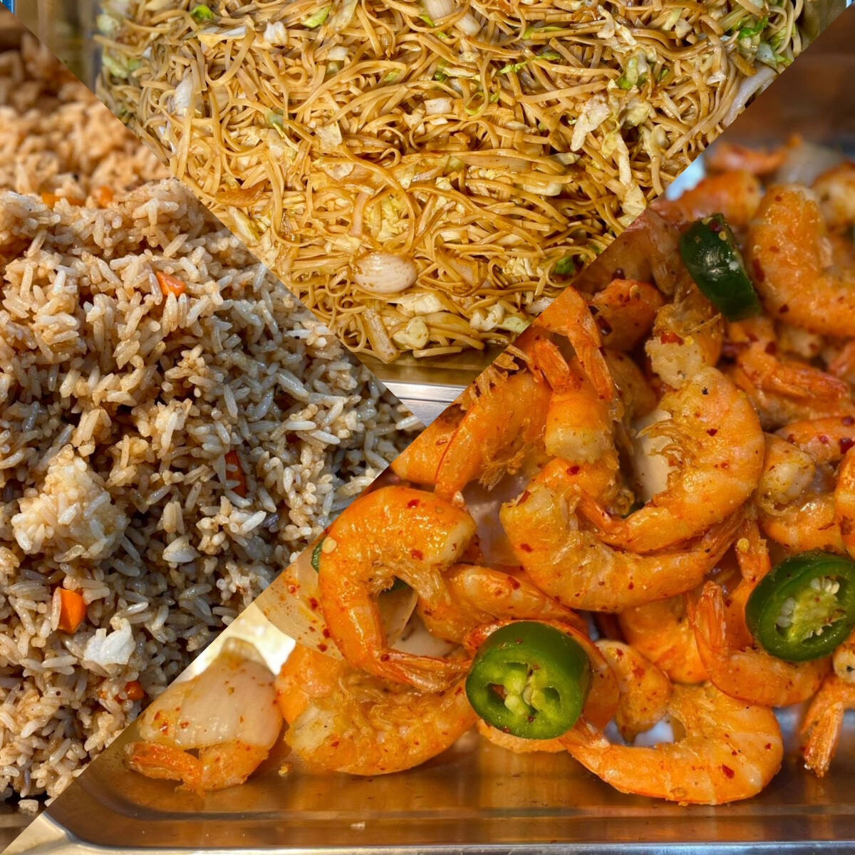 Plato Grande de 2 Guisos con 8 Camarones y Arroz o Tallarines