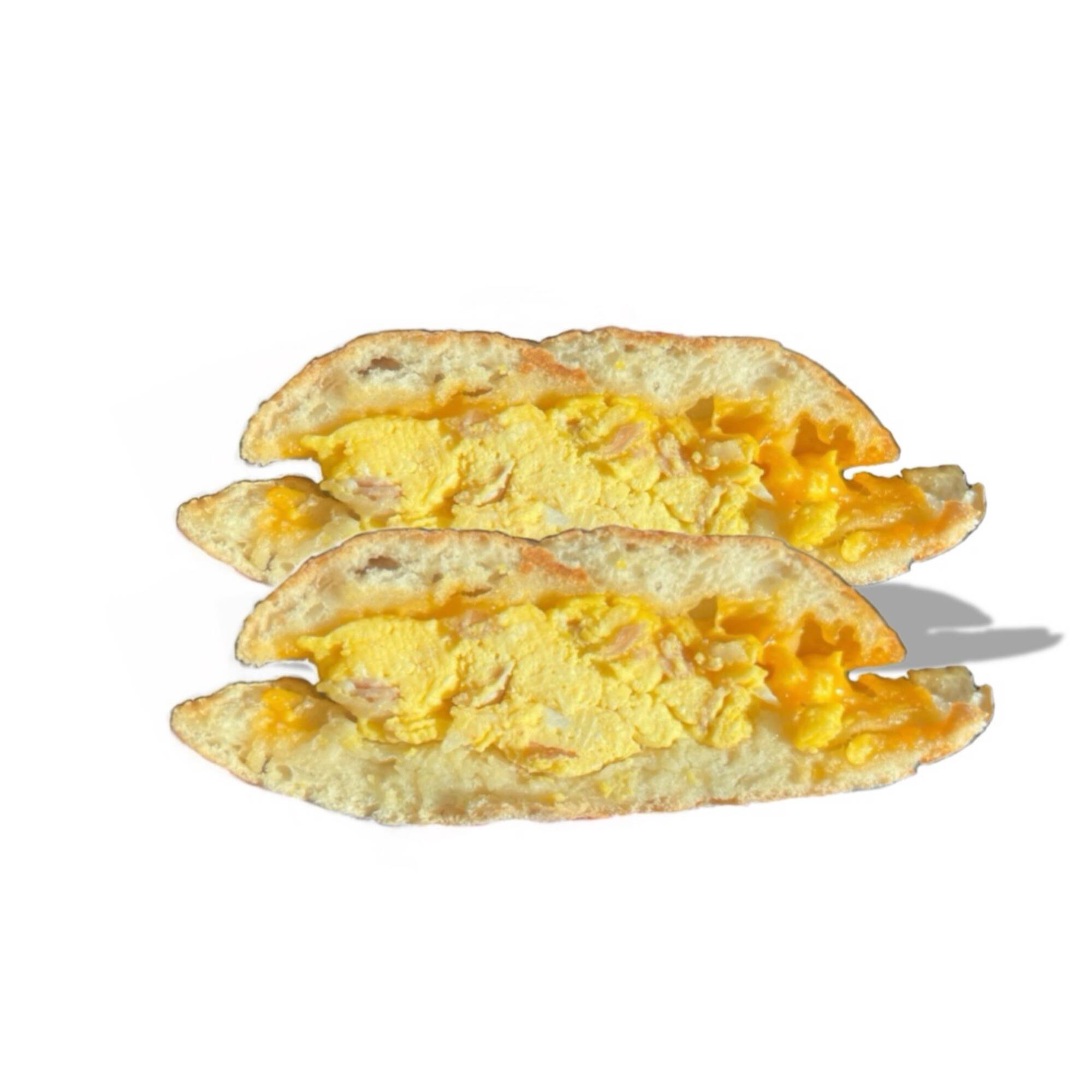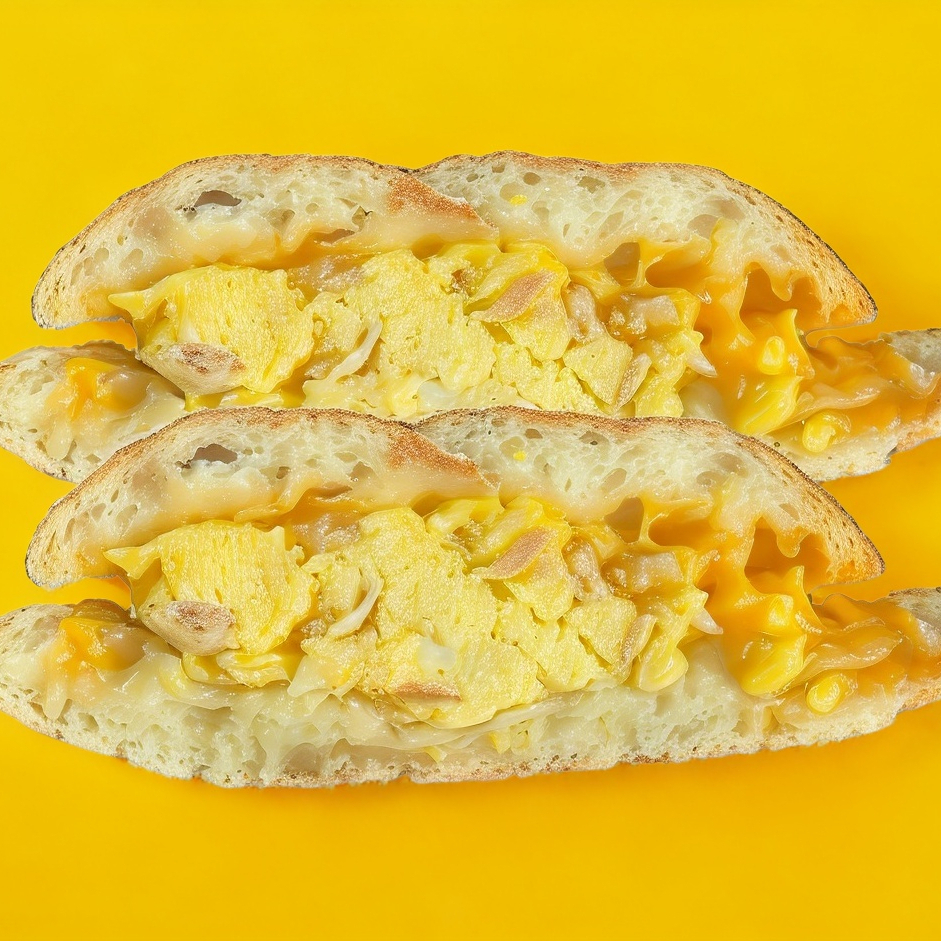 este delicioso sandwich está hecho con pan ciabatta tostado y relleno de huevo revuelto, tocino crujiente y queso cheddar.