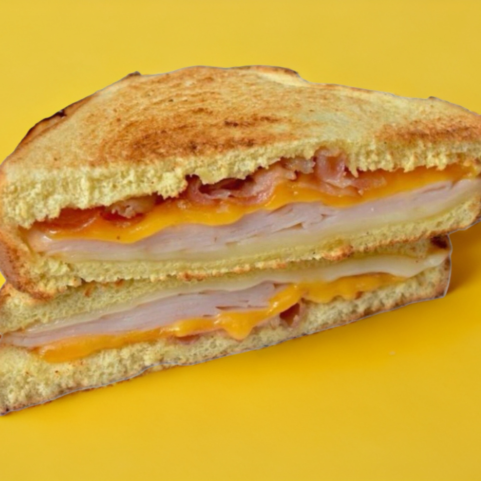 Emparedado de jamón de pechuga de pollo con tocino, queso cheddar y muenster..
