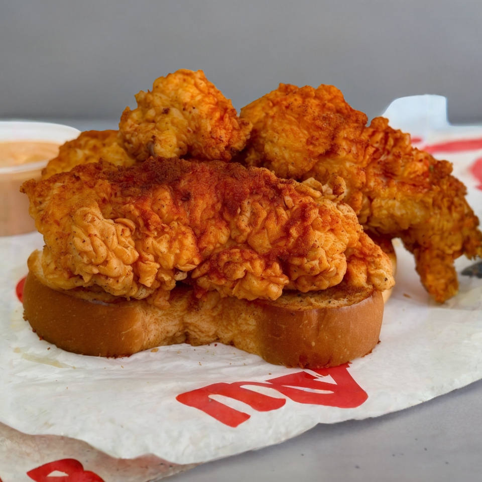 Tiras de pollo frito picantes, pan de caja, 1 dip (aderezo)