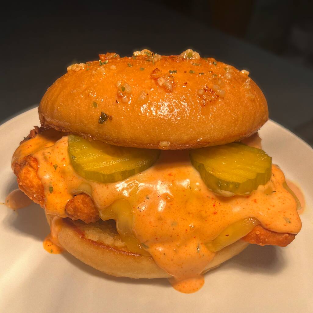 Pechuga de pollo frita, pepinillos, queso gouda, salsa buffalo ranch y mantequilla con ajo.