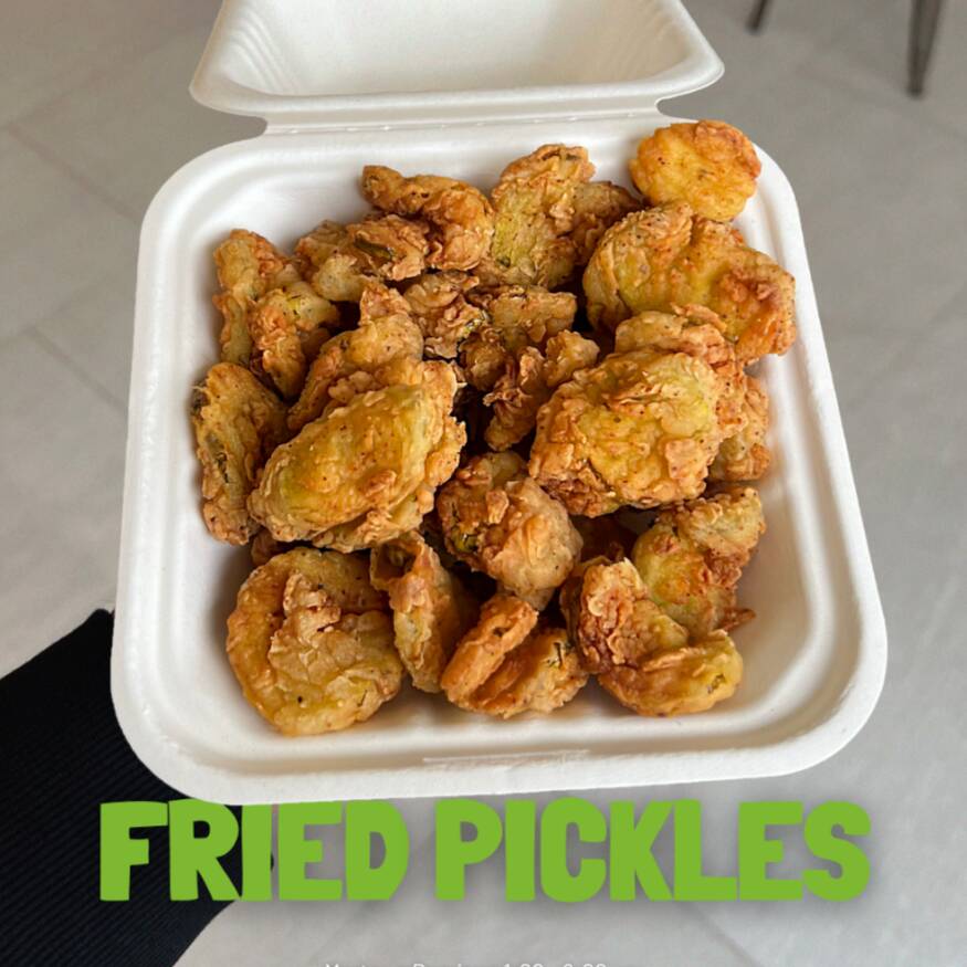 Pechuga de pollo frito bañada en hot honey, pepinillos caseros, aderezo.