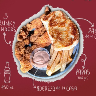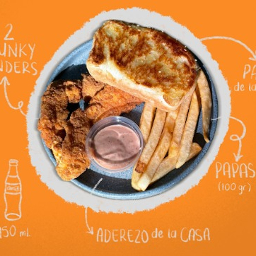 El classic para no quedarte con ganas, incluye 4 tenders receta crujiente, papas fritas a la francesa 150 g, refresco de Coca Cola 450 ml y un aderezo de la casa para chopear tu crunky jr.