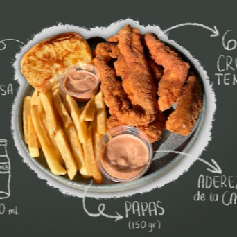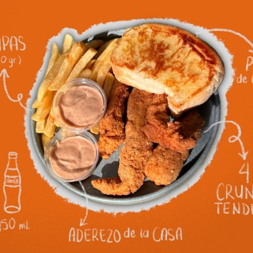 Para botanear o para los kids, incluye 2 cruny tenders, papas fritas a la francesa 100 g, refresco Coca Cola original de 450 ml y aderezo de la casa.