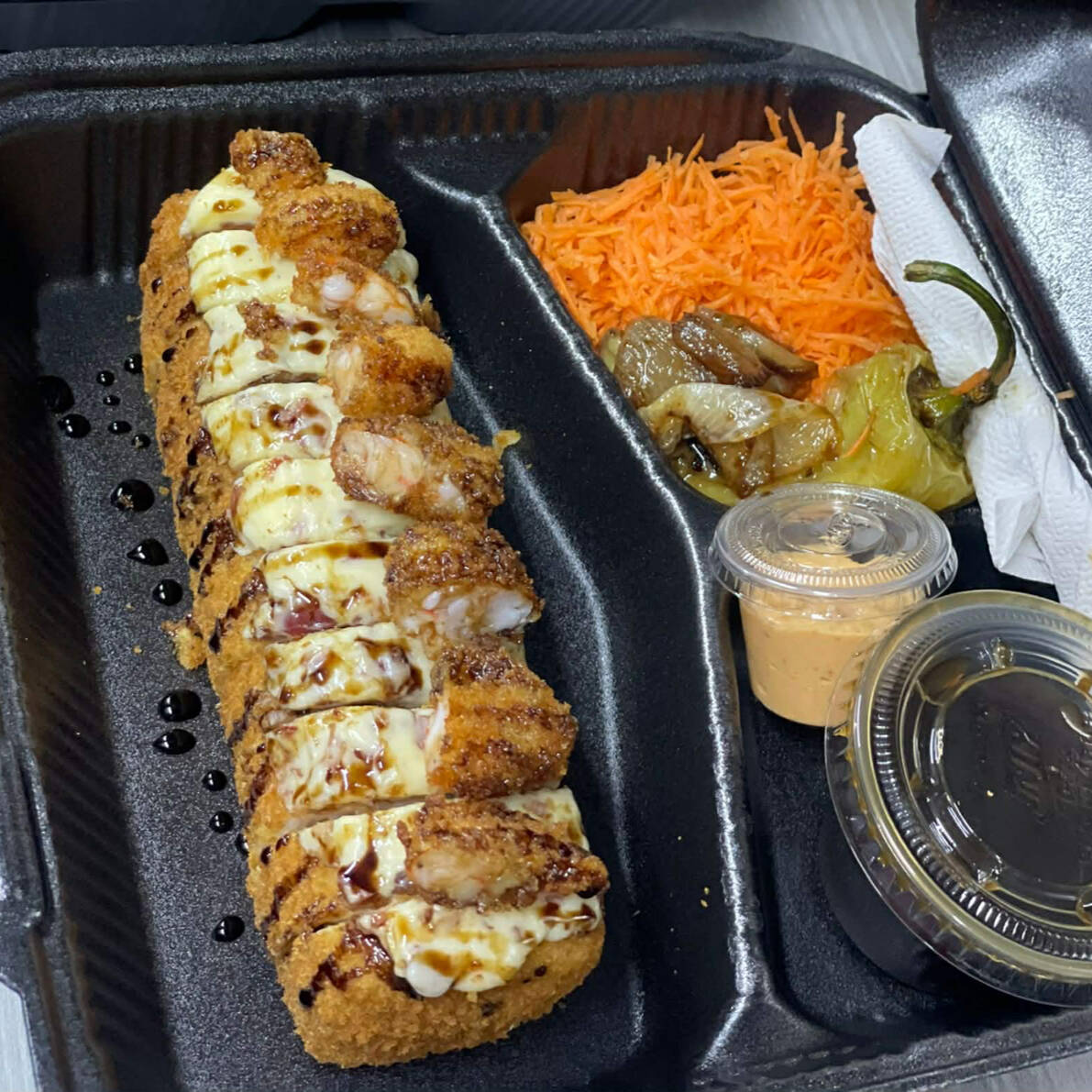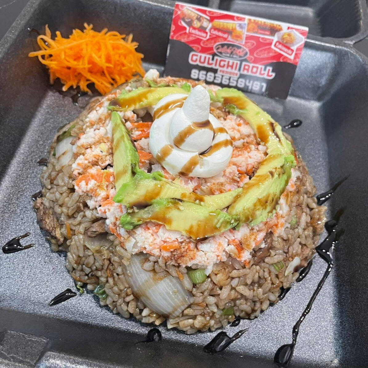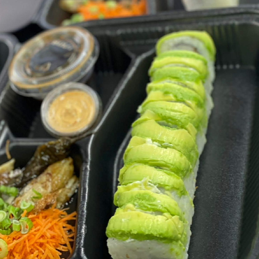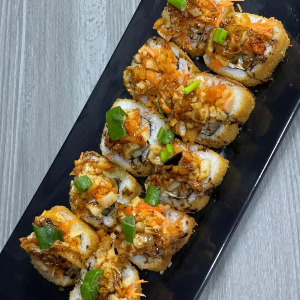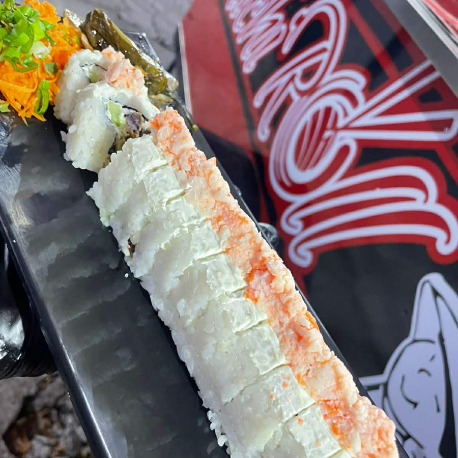 Philadelphia, Aguacate, Pepino, Res y Camaron, Coronado con Surimi, Sirracha y Chile Serrano