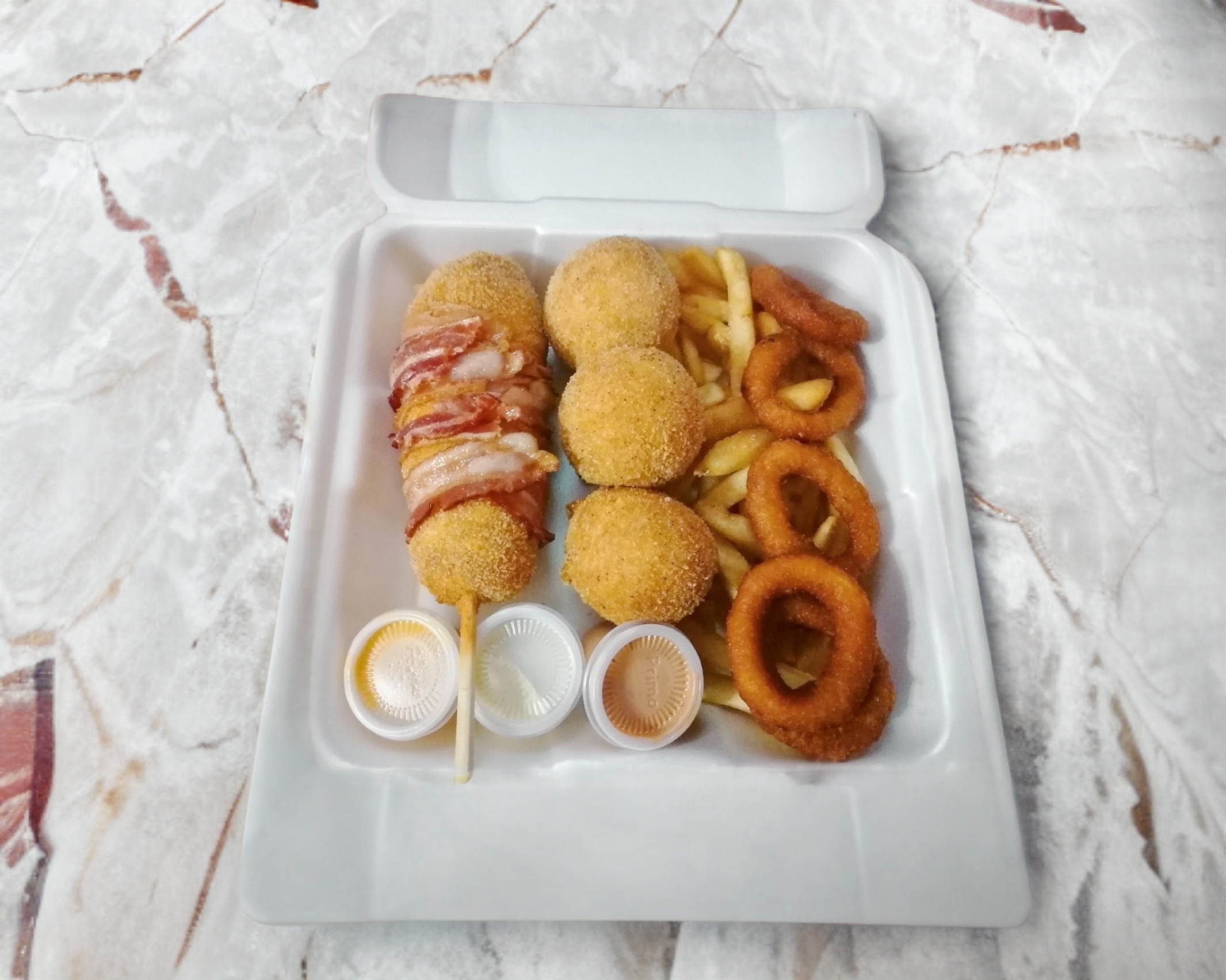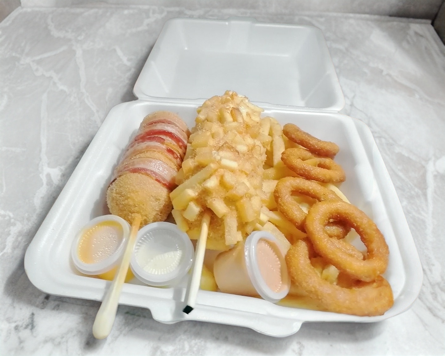 Dos pizza wafles estilo coreanas más una orden de papas y aros