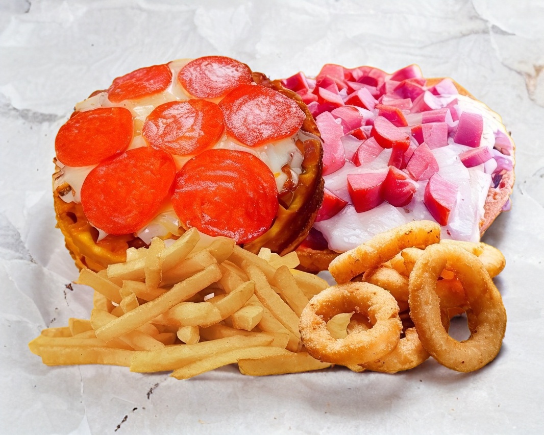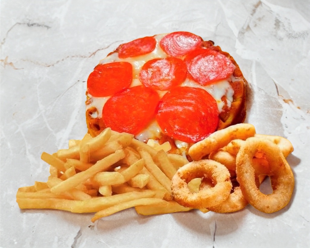 COMBO DE PIZZA WAFLE, PAPAS Y AROS DE CEBOLLA