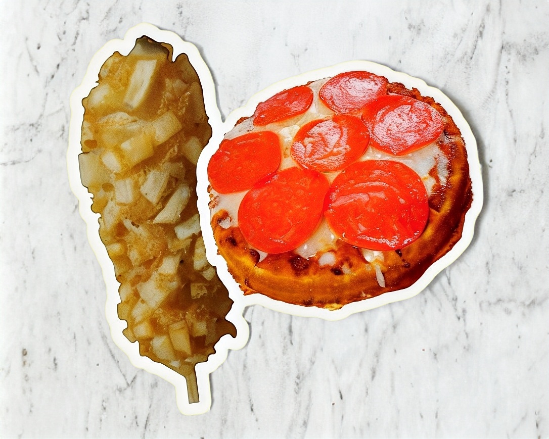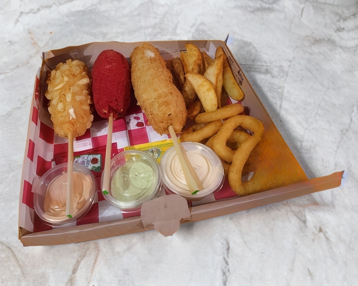 Una comida típica callejera coreana que conciste en un wafle con los ingredientes de una pizza, más papas y aros de cebolla