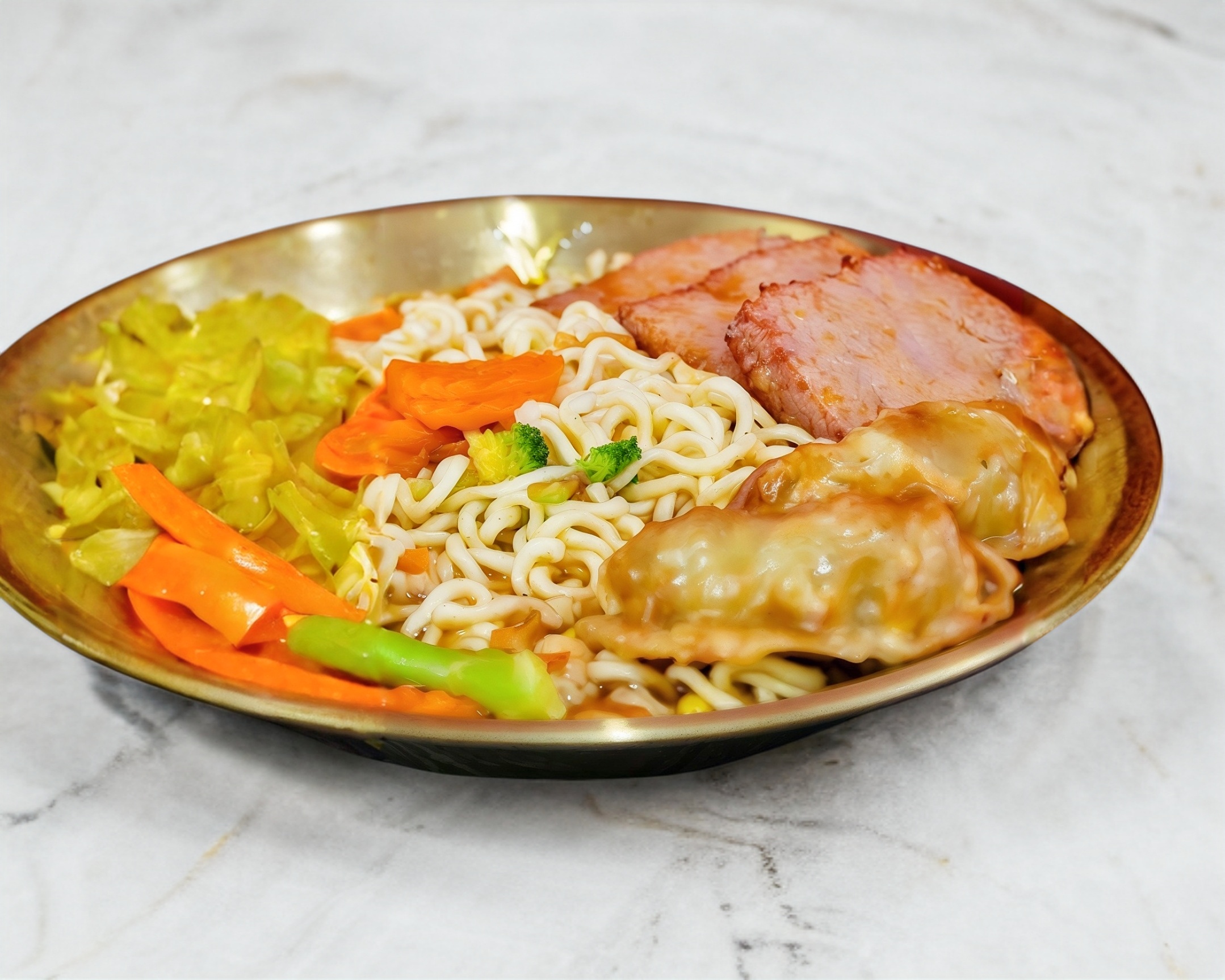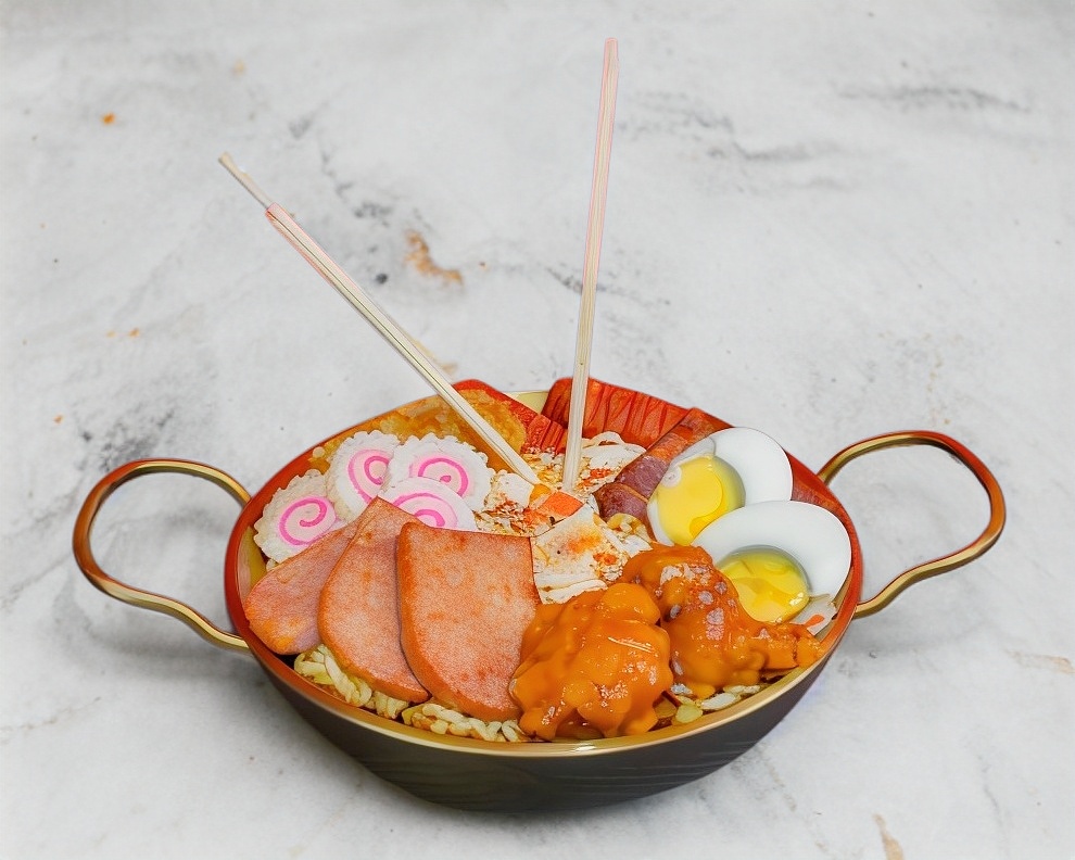 (el platillo viene dividido debido a la cantidad de toppings)Ramen a elegir entre sabor samyang picoso, kimnchi, picoso con caldo y marisco, con Naruto, huevo, gyozas, salchicha,tocino, verdura, pollo y panceta