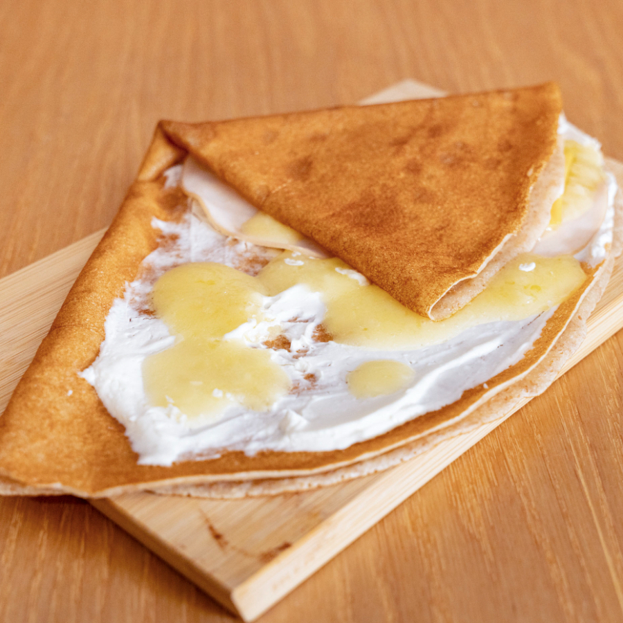 La favorita de los cheese lovers: crepa rellena con la mezcla perfecta de queso amarillo, manchego y queso crema, fundidos a la perfección.