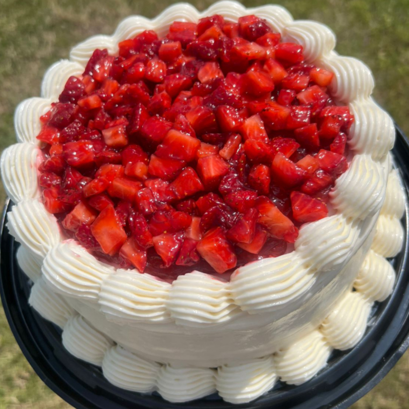 Masa tradicional, rellena de trozos de cheesecake con topping de queso crema y mermelada de fresa