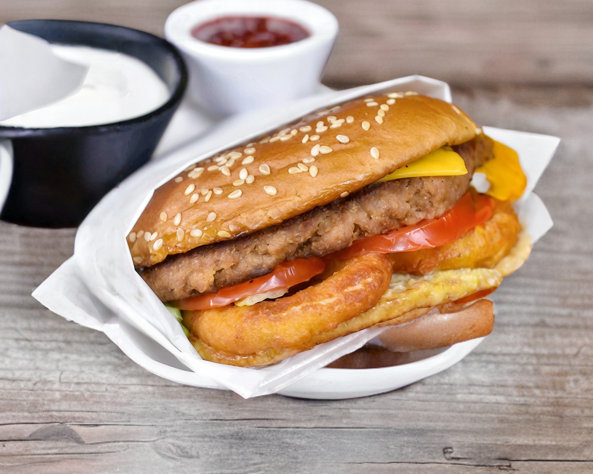 Carne de res, queso amarillo, aros de cebolla, salsa BBQ, lechuga, tomate y mayonesa.