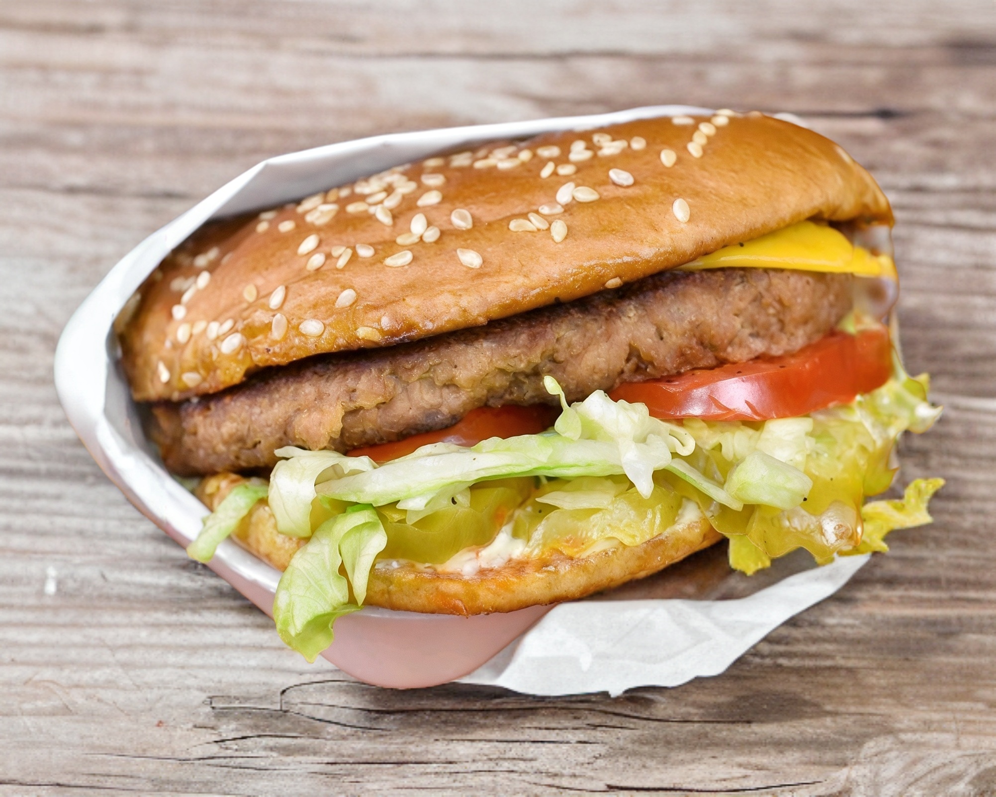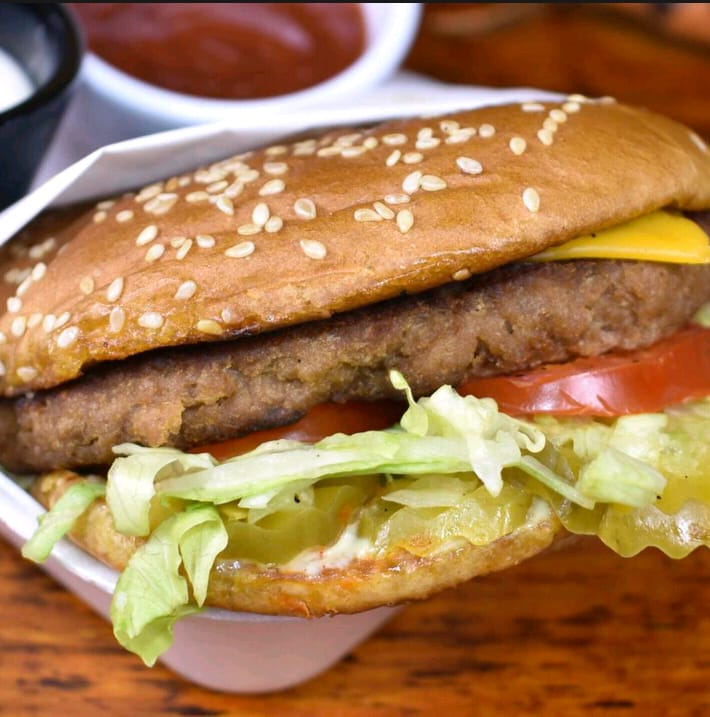 Carne de res, queso amarillo, lechuga, tomate, cebolla, pepinillos, mayonesa y mostaza.