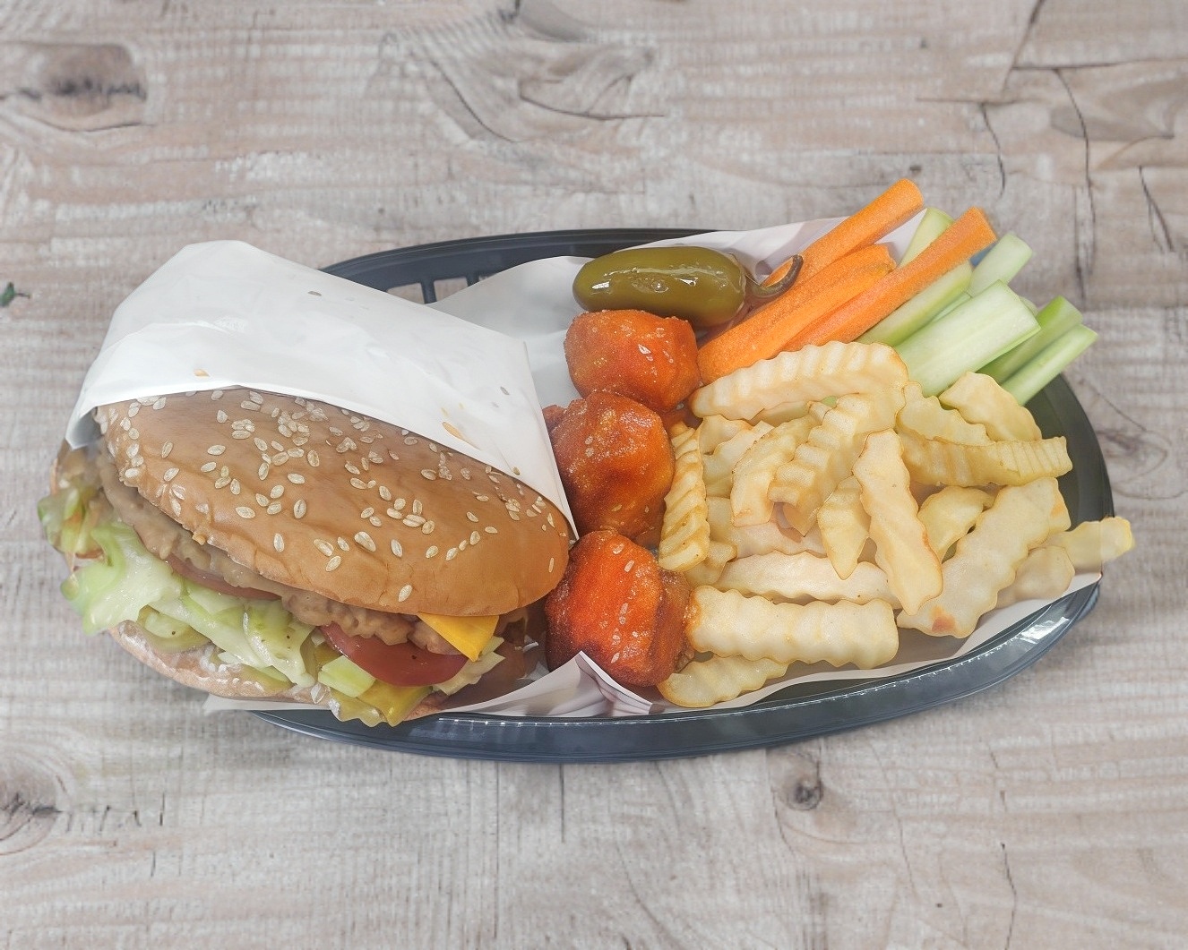 1 Hamburguesa clásica, 3 alitas o boneless, 1 orden de papas fritas y refresco de 355 mililitros.