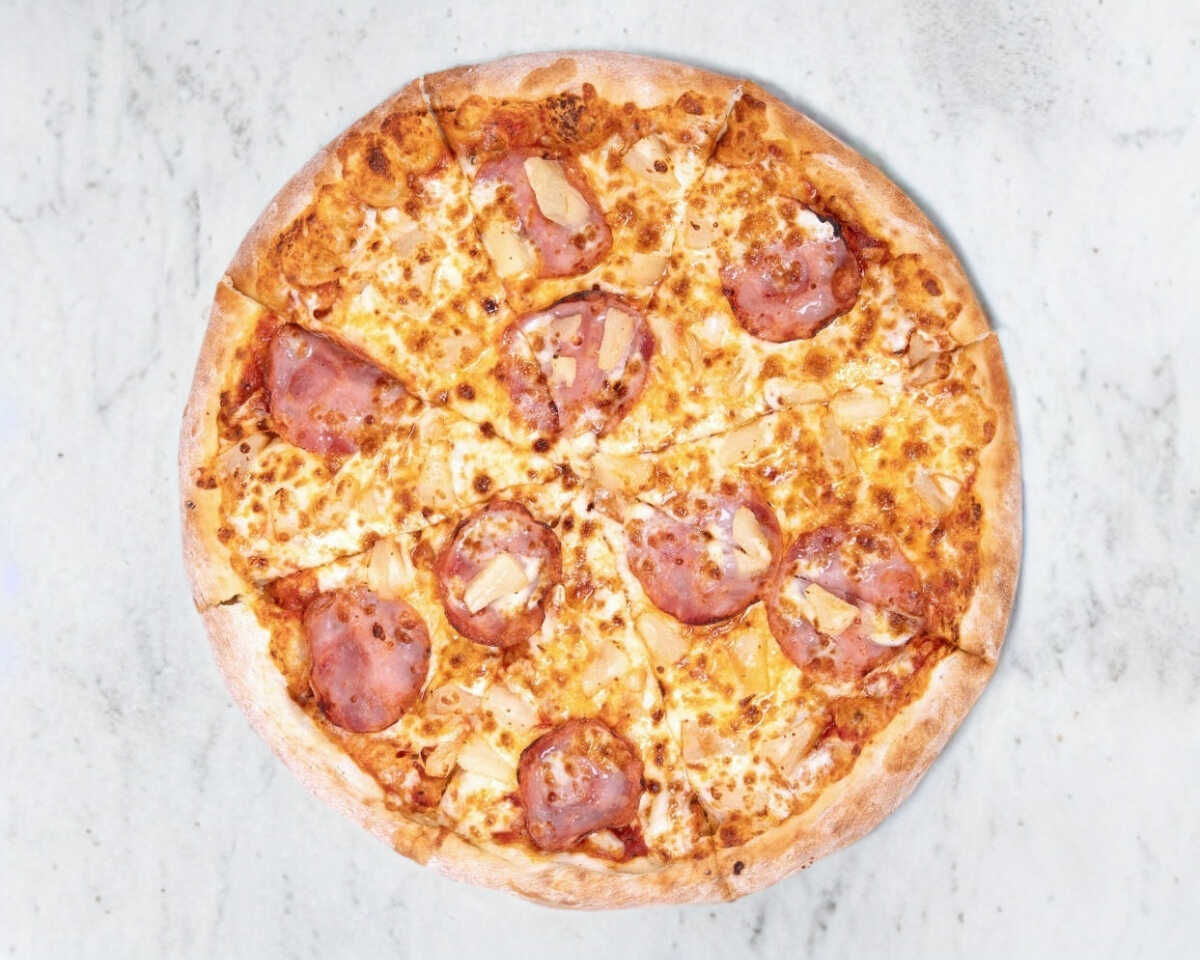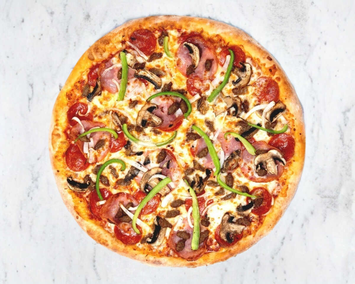 Nuestra especialidad de 14" Queso, Jamon, Pepperoni, Salchicha Italiana, Pimiento Verde, Cebolla y Champiñones