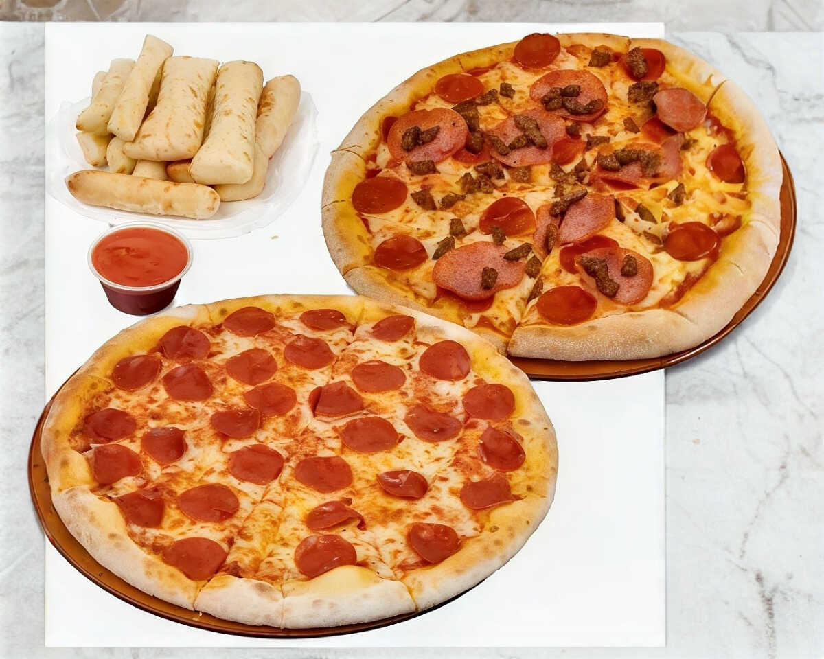 Una Pizza de 14" de Pepperoni, Queso o Mitad y Mitad + Una Pizza 14" de Especialidad + Breadsticks o Papas