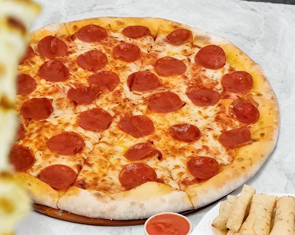 Deliciosa Pizza de 14" de Pepperoni, Queso o Mitad y Mitad + Breadsticks o Papas