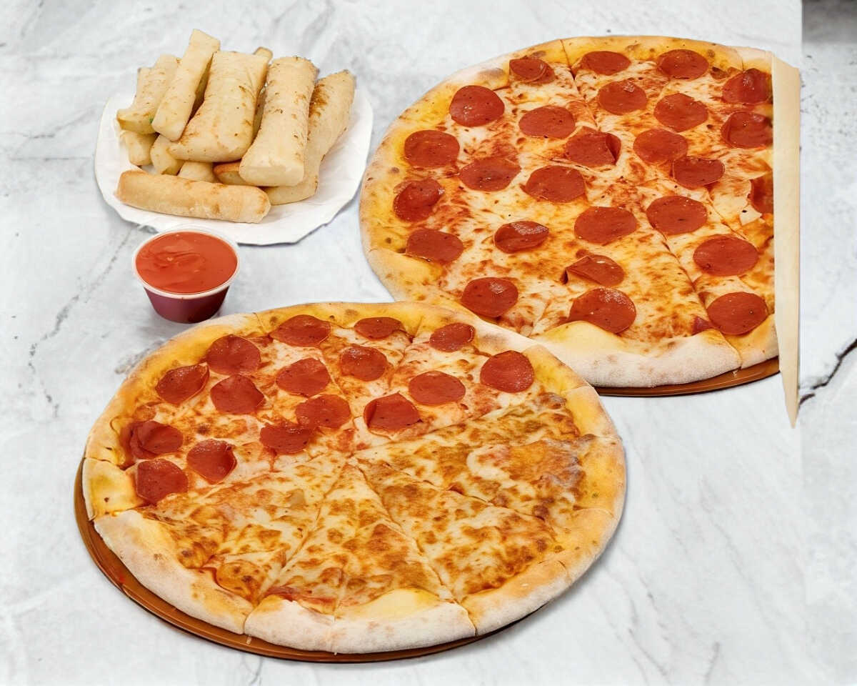 Dos Pizzas de 14" de Pepperoni, Queso o Mitad y Mitad + Breadsticks o Papas