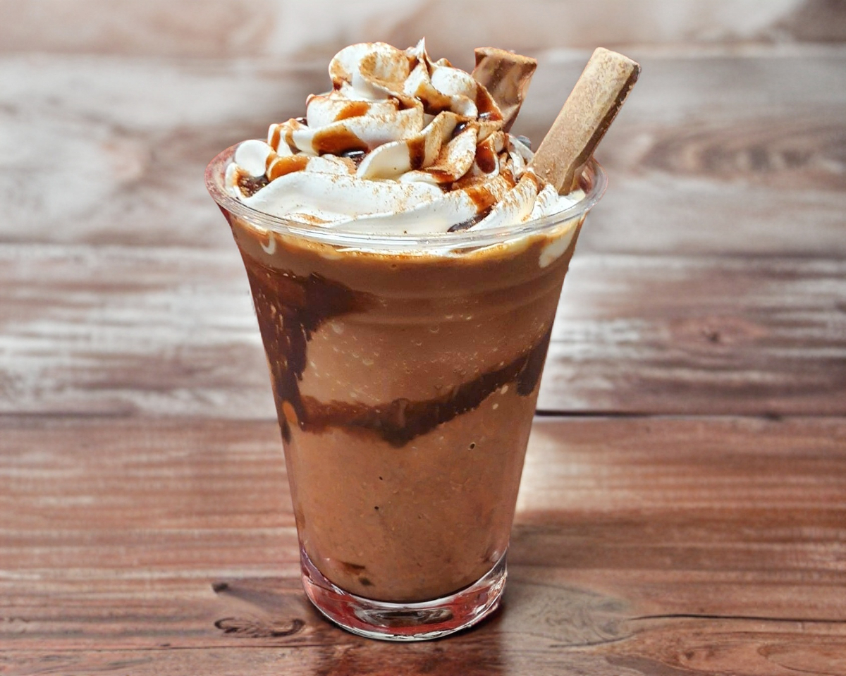 Bebida estilo frappe sabor chocolate Calor V, decorada con crema batida, chocolate en polvo y una espiral de chocolate liquido.