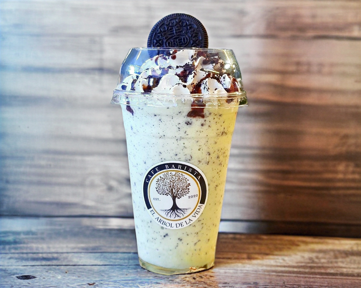 Bebida estilo frappe sabor oreo y menta, decorada con crema batida, galleta molida y una espiral de chocolate liquido.