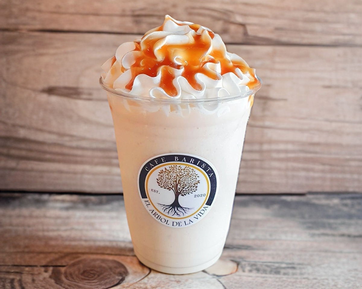 Bebida estilo frappe sabor caramelo, decorada con crema batida y una espiral de caramelo liquido.