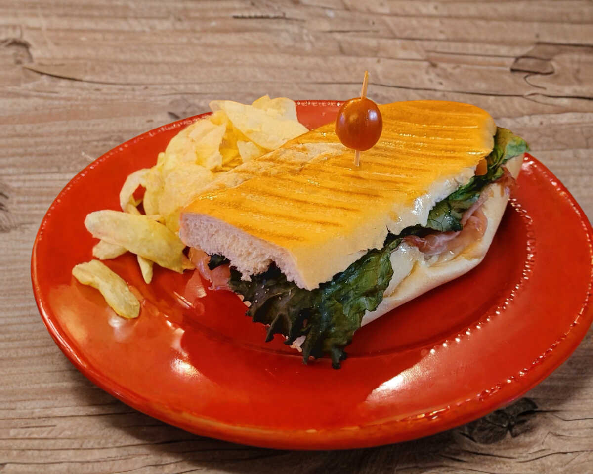 Panini al horno, aceite de oliva, jamón serrano, queso mozzarella, aceituna negra, morrón, jalapeño, lechuga, tomate y cebolla morada, acompañado de papas fritas