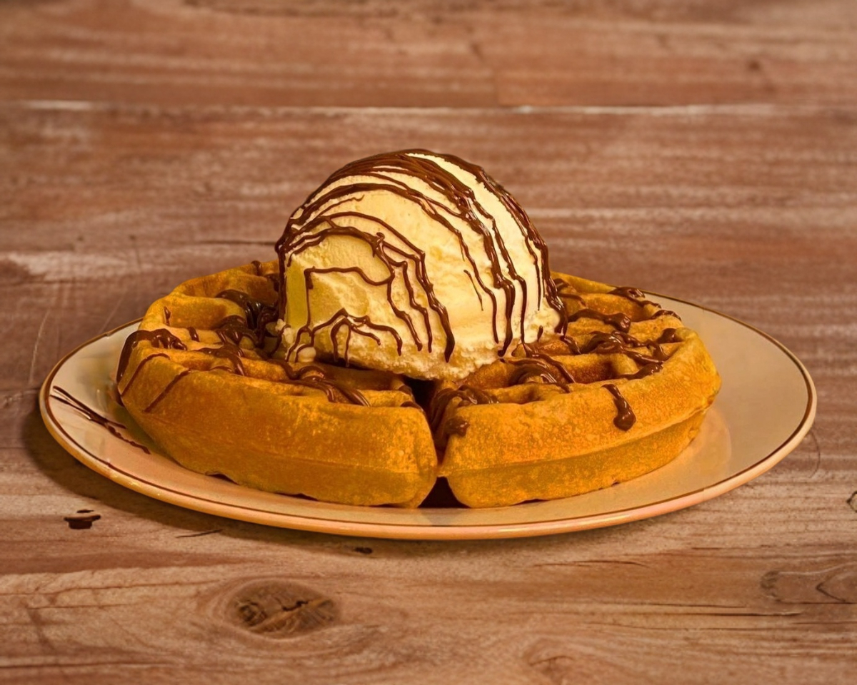 Waffle preparado con topping, nieve + 1 bola de helado