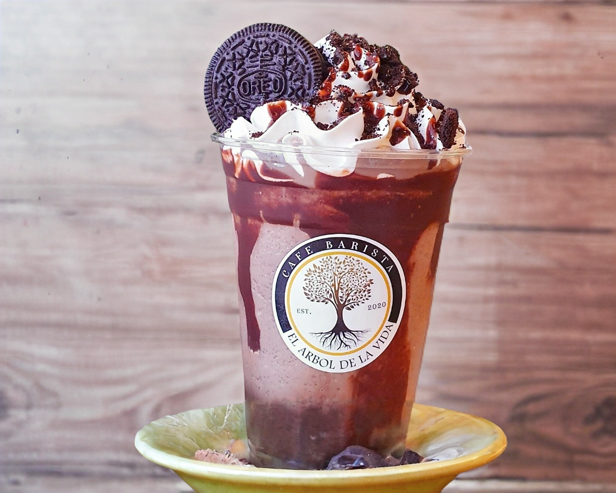 Bebida estilo frappe sabor oreo y chocolate, decorada con crema batida, galleta molida, una espiral de chocolate liquido y chocolate en polvo.
