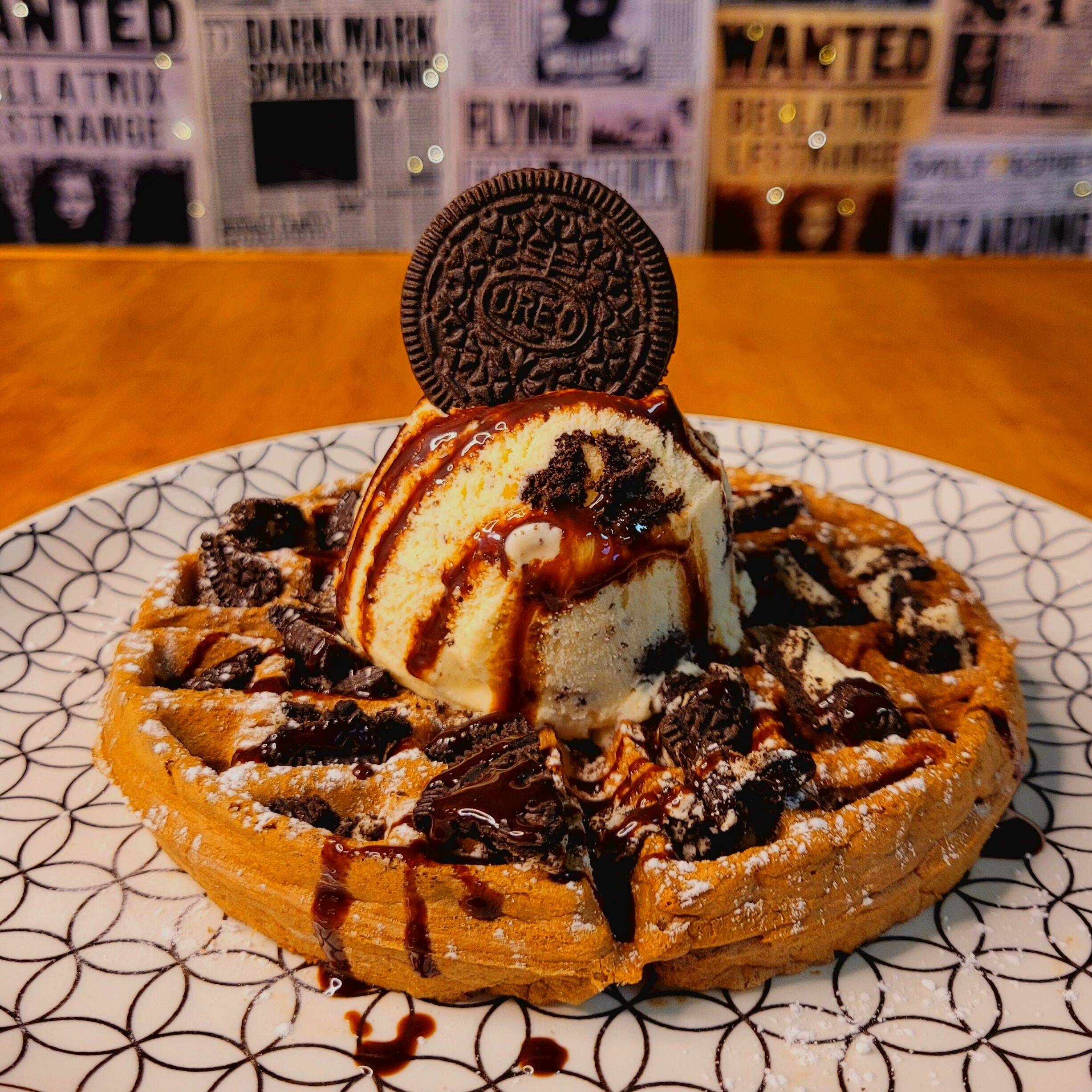 Waffle de Chocolate, con Jarabe de Chocolate, Galleta OREO molida, Nieve de Cookies & Cream y azucar glas