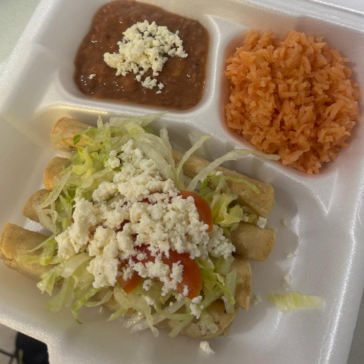 4 FLAUTAS DE DESHEBRADA NATURAL ACOMPAÑADAS DE ENSALADA LECHUGA TOMATE Y QUESO, ADEMAS DE FRIJOLES CON QUESO Y ARROZ